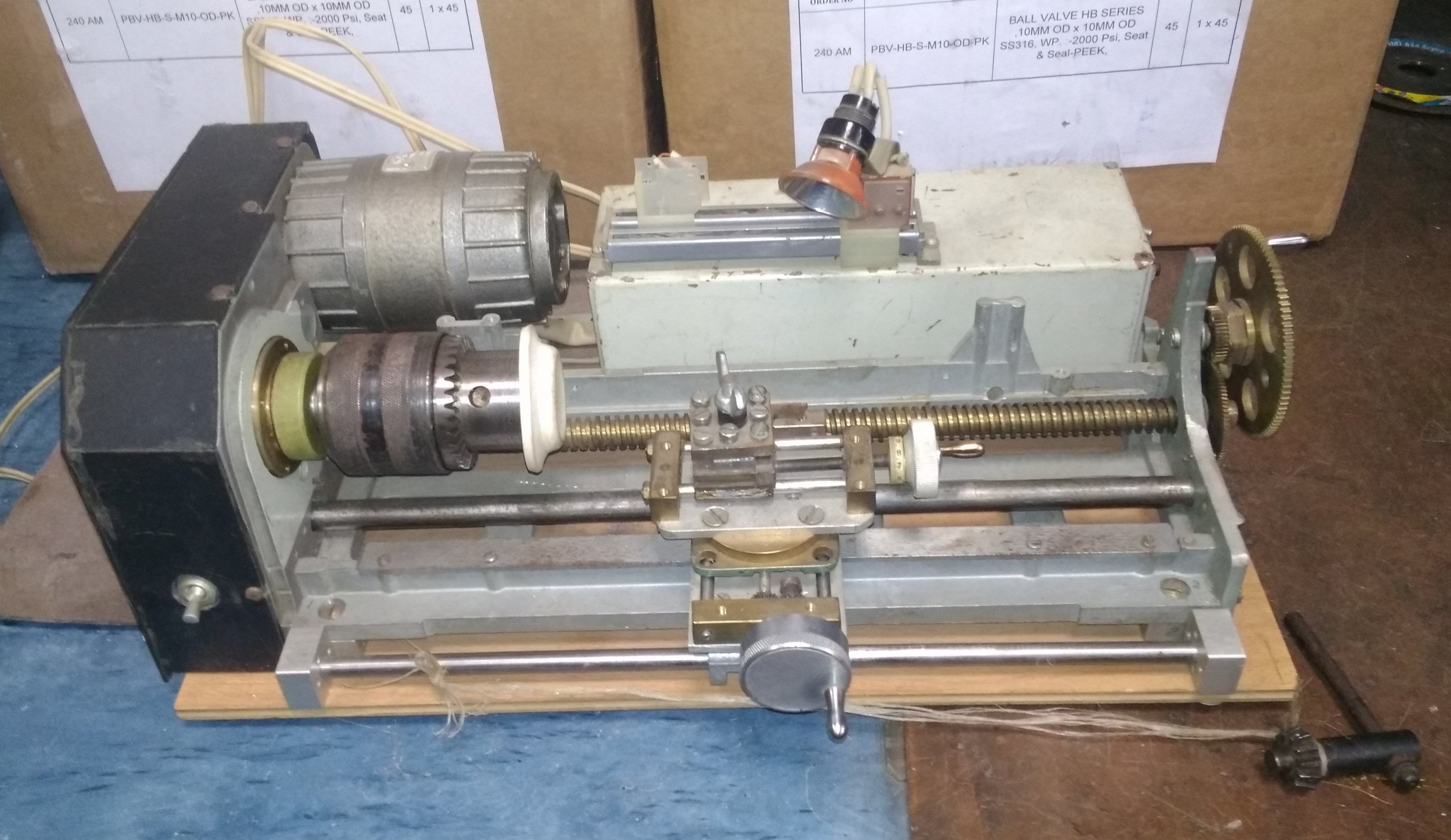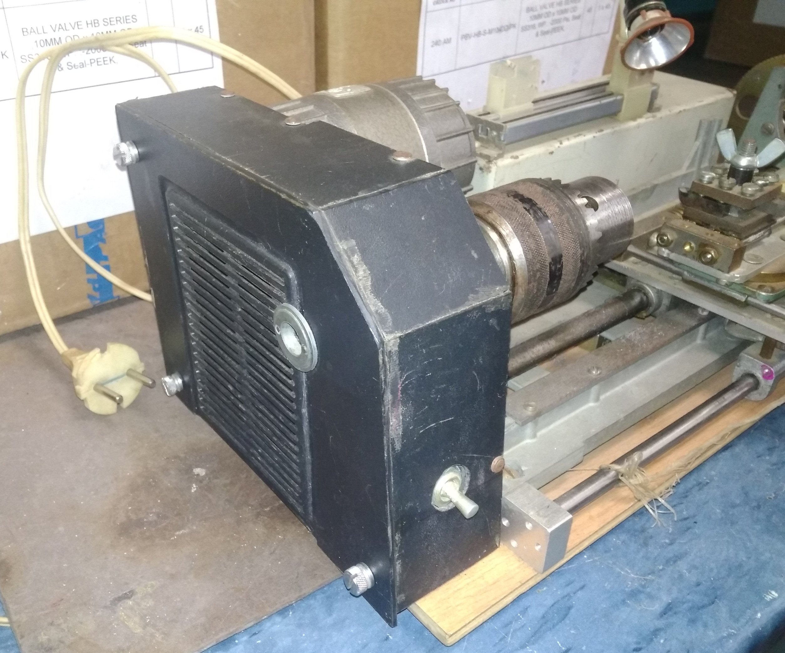 Общий вид. Патрона токарного маленького не нашел (не было тогда ещё Али-Экспресса), поставил большой сверлильный. Быстрое перемещение суппорта ручкой справа. Для точной - есть на самом суппорте. Оборудован подсветкой (тоже перемещается, но отдельно от суппорта, вручную).