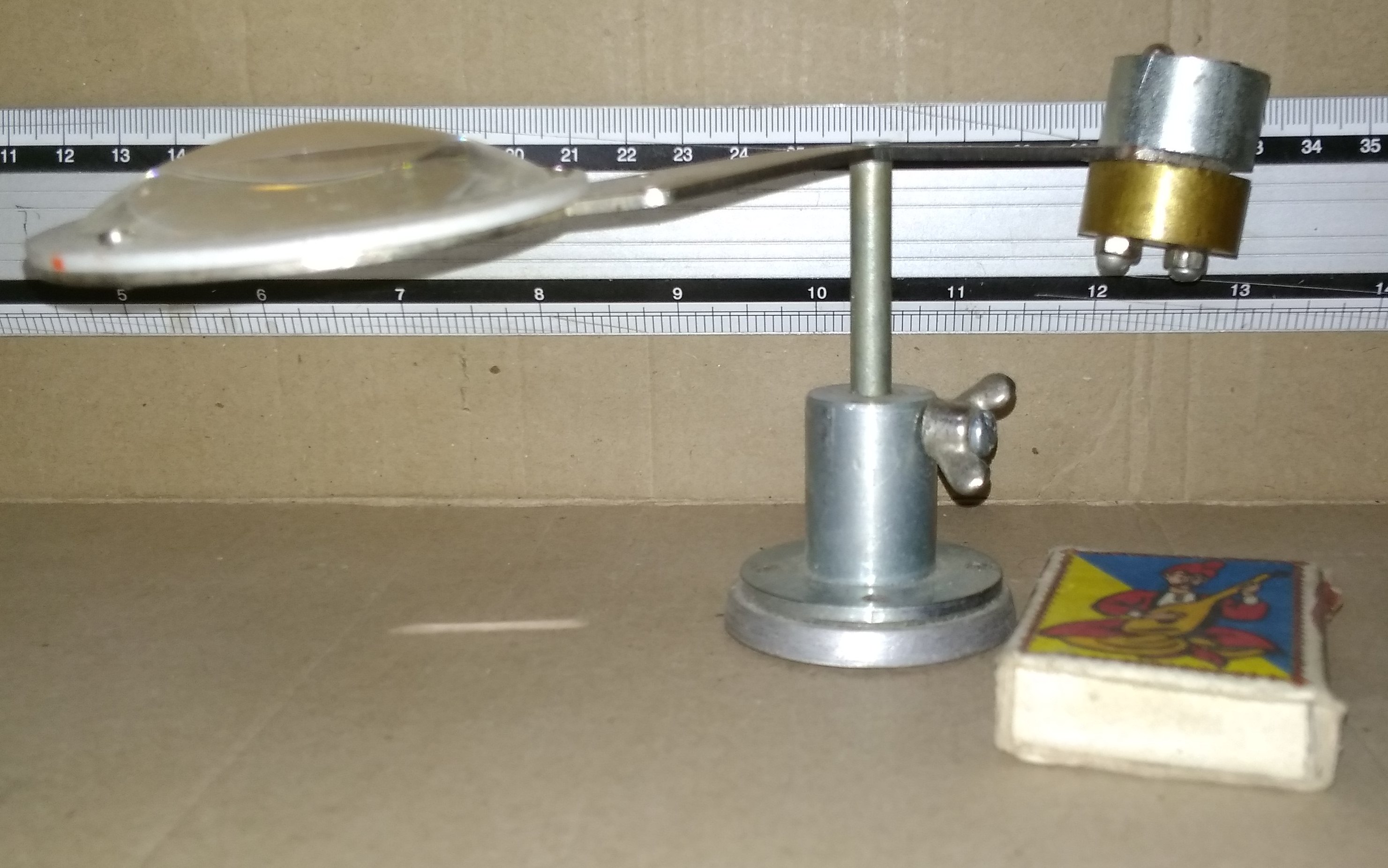 Высота ножки регулируется, поворачивается на оси, снабжена противовесом. Массивное основание обеспечивает устойчивость. Вобщем довольно удобно при работе с мелкими деталями. Хотя если ненароком зацепить, то всё-таки может упасть. Для этого есть немного другой, более массивный вариант...