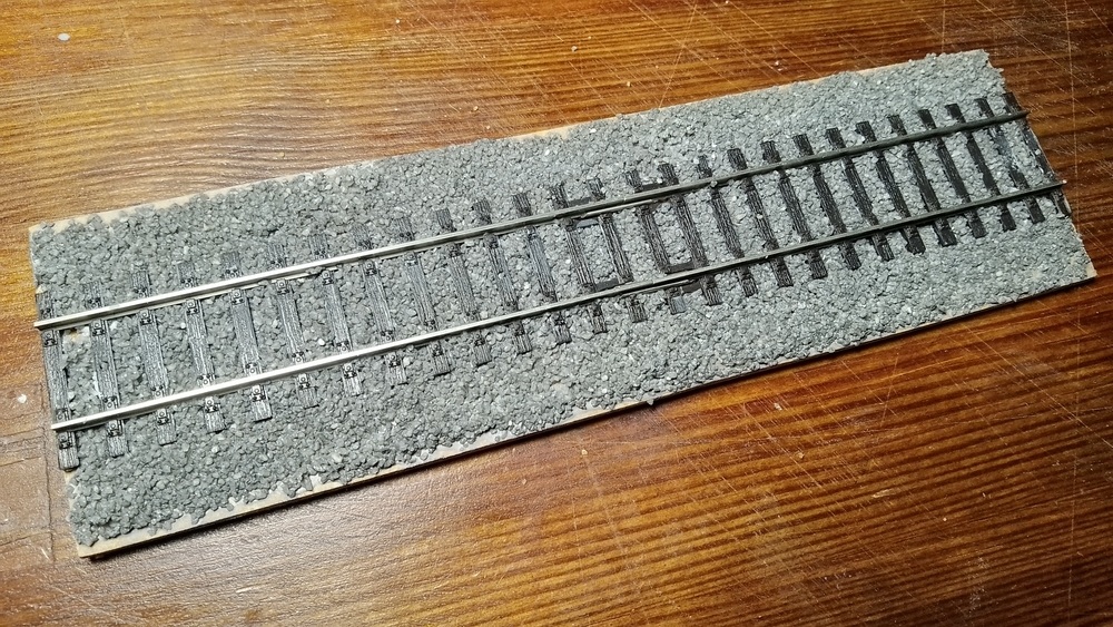 Но есть готовый балласт, и цена на него такова, что дешевле будет его купить. Что такое меньше 100 грн за 1 кг? Ничто. Заказал. Попробовал. Сперва рассыпал балласт на подставку с рельсами, затем, набирал в шприц разведённый ПВА с художественным серым акрилом, промакивал слой балласта. Прилагаю, фото, что получилось.