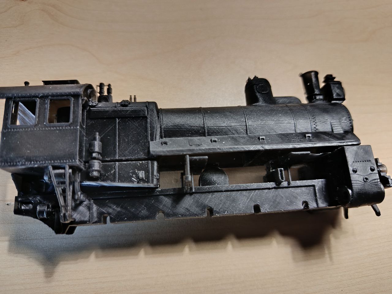 поделюсь новым наблюдеиием касательно 3д печати. В последнее время я перешел на спирторастворимую ABS like pro 2 с водорастворимой. Она значительно более прочная и вроде как долговечнее. Еще плюсом практически не дает изгиба прямых поверхностей при запекании. Но у нее есть особенность, она более жесткая и хуже отрывается от пленки при печати. Что при толстых стенках дает деформации и утяжины. Выходом стали тонкие стенки (порядка 1-1,2 мм. При обычной смоле, наоборот, лучше 2 мм) и покупка нагревателя для камеры 3д принтера (в основном потому что отопления нет и ждать лета, что б что то напечатать так себе идея). Обогреватель поддерживает нужную температуру в камере и смола становится более текучей (у меня в ванной даже шампунь стал с большим трудом вытекать из бутылки). С снимках распечатки первого Э, так это одна из первых моделей у меня, когда стенки тендера напечатались полностью ровными. На паровозе так же нет никаких дефектов. Линии на котле - это особенность печати круглых поверхностей при невысоком разрешении экрана, от этого никуда не деться, только вручную шлифовать