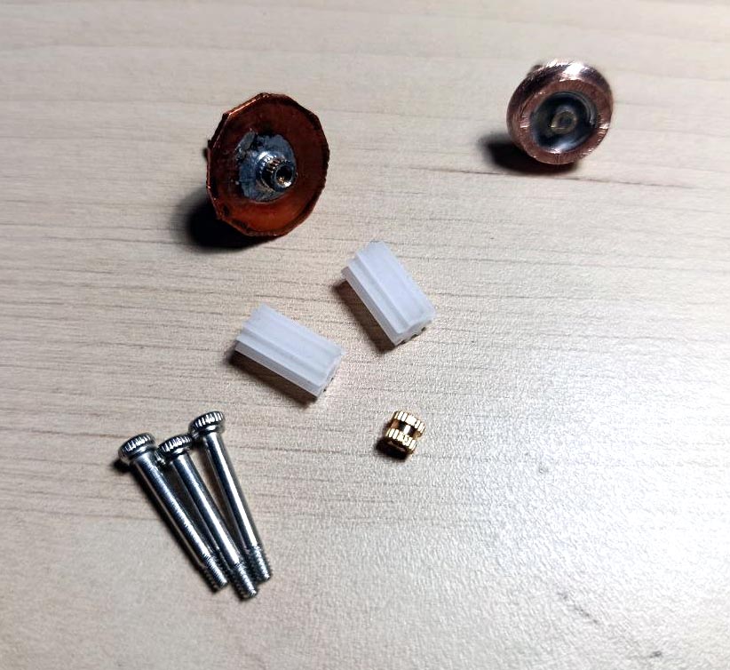 небольшое дополнение по колесам на изолированних полуосях. Так как нарезать резьбу на полуосях не самое приятное занятие да и плашка довольно быстро тупится, то нашел на Али такие винты 2 мм толщиной. Осталось только откусить шляпку. На резьбу нанесена паяльная паста, все скручивается и разогревается. Полуоси соединяются широкими шестернями тоже с Али. На фото отдельные детали и черново обточенное колесо в сборе