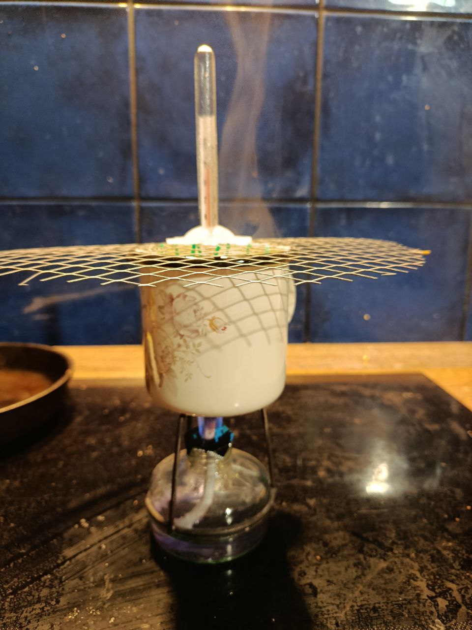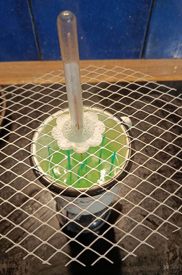 пришел раствор для химического никелирования и я сразу его опробовал. Удивительно, но все получилось. Колеса как обычно, спаяны из меди (диаметр 12 мм), осталось в центр залить эпоксидки, что б убрать дырку. В кружку на 0,4 л залил 200 грам раствора и нагрел на газовой плите до 87-93 градусов, если термометр не врет. Потом переставил на спиртовку, опустил колеса (они висят не касаясь дна и друг друга на садовой проволоке) и держал в таком виде порядка 1 часа 15 минут (спиртовке не хватает мощности довести до кипения, но и остыть не дает, что удобно). За это время испарилась половина жидкости и остаток стал заметно мутный. В теории можно долить воды и еще использовать. На дне кружки немного серого осадка (вероятно никель) и зеленых кристаллов, которые плохо отмывались с кружки (а никель полностью и не отмылся, благо я кружку не планировал использовать иначе). Поверхность затянуло без дефектов, кроме как на одном колесе сзади небольшое пятно голой меди. Ради интереса попробовал сзади соскоблить слой кончиком скальпеля, при небольшом усилии он не царапается, а если приложить значительное усилие, то можно процарапать до меди. В инструкции обещают за 1 час слой никеля 10 мкм