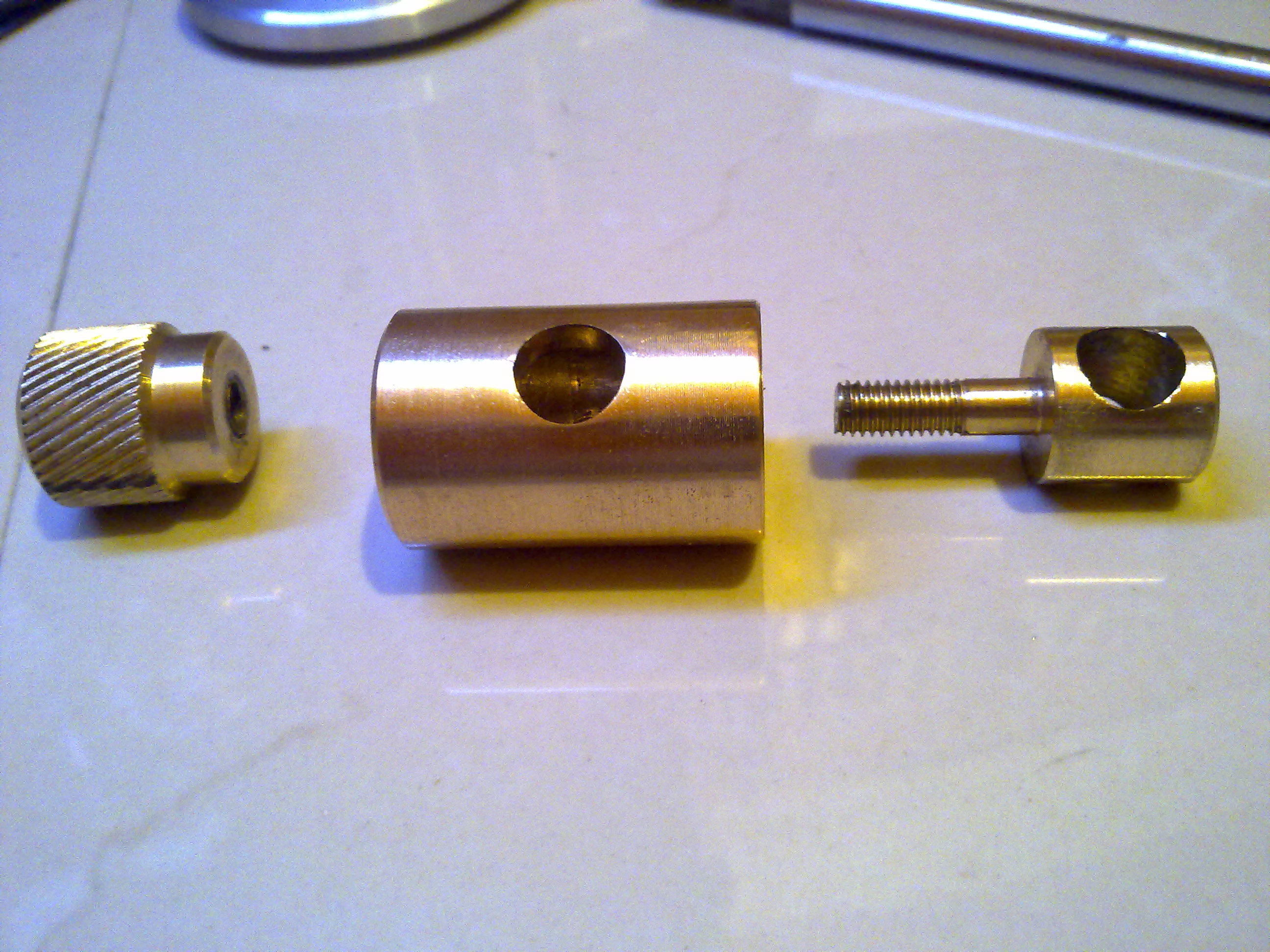 Так вот. Когда прорисовывал свою стойку индикатора, думал фиксировать штоки простым винтом. Попробовал - не понравилось. Точной фиксации нет, болтается все как-то. Корочь, усложнил себе работу, но сейчас доволен. Штоки калиброванные от амортизаторов. Фиксация смещением отверстий втулки и стакана прощает небольшие отклонения их размеров. Перемещение штока плотное и без болтанки, как по маслу.