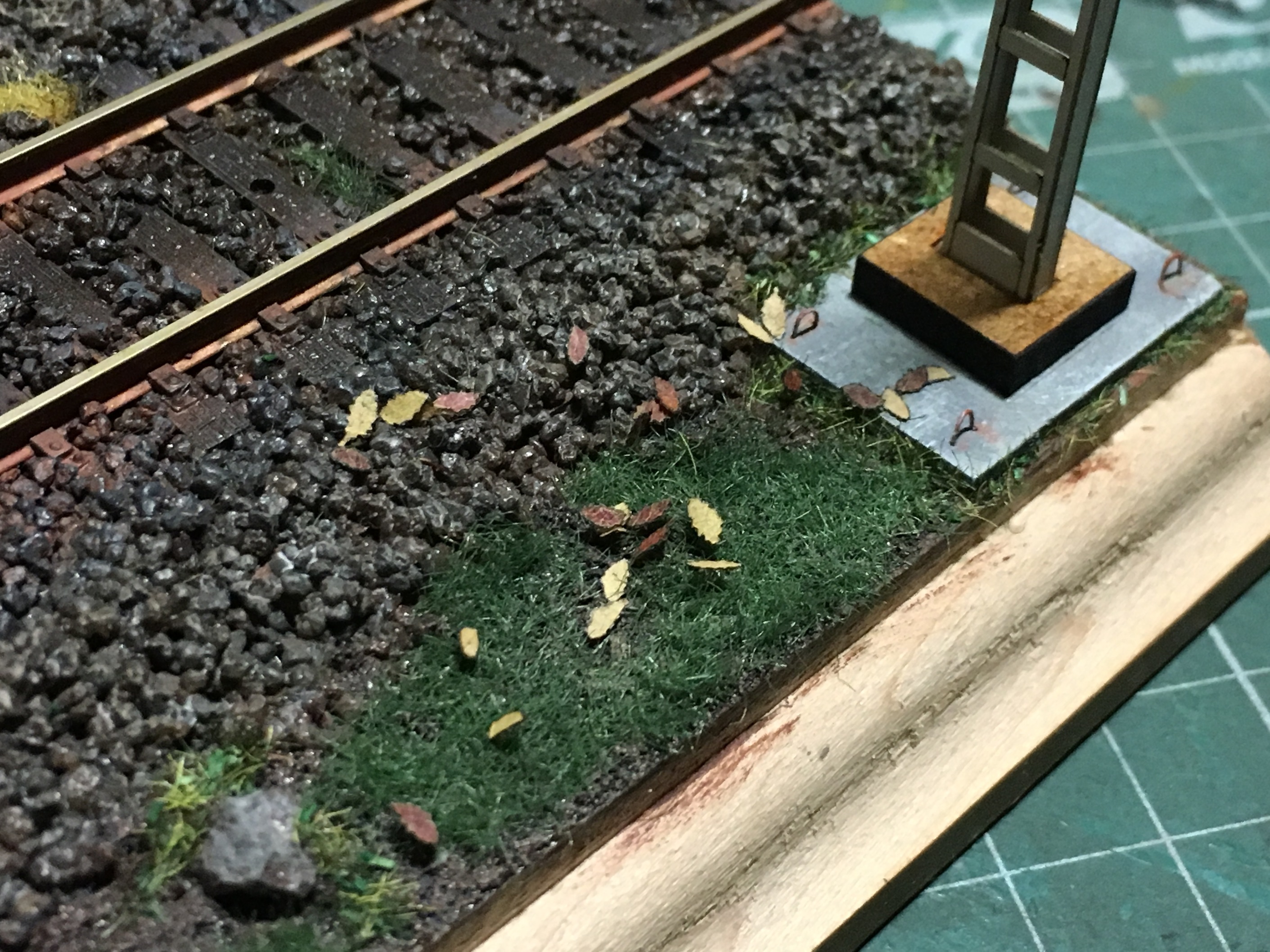 Для этих целей я использую самую мелкую присыпку Woodland Scenics зелёных оттенков, которые можно наносить в чистом виде или смешивать между собой. Причём на данный момент, альтернативы торфу Woodland Scenics, я не нашел, ибо эта фирма делает самую мелкую присыпку, практически пыль.
