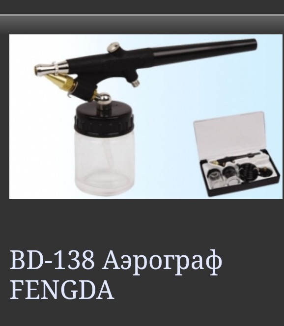 Испытания проводились с такими аэрографами. BD-138 с соплом 0,8 сразу выбыл - не хватает давления для захвата любой краски. При заливке просто растворителя образуется факел длиной пару сантиметров и все.BD130 с соплами 0,3 и 0,5 показал отличные результаты с акрилами и эмалями. Даже с ГФ-021