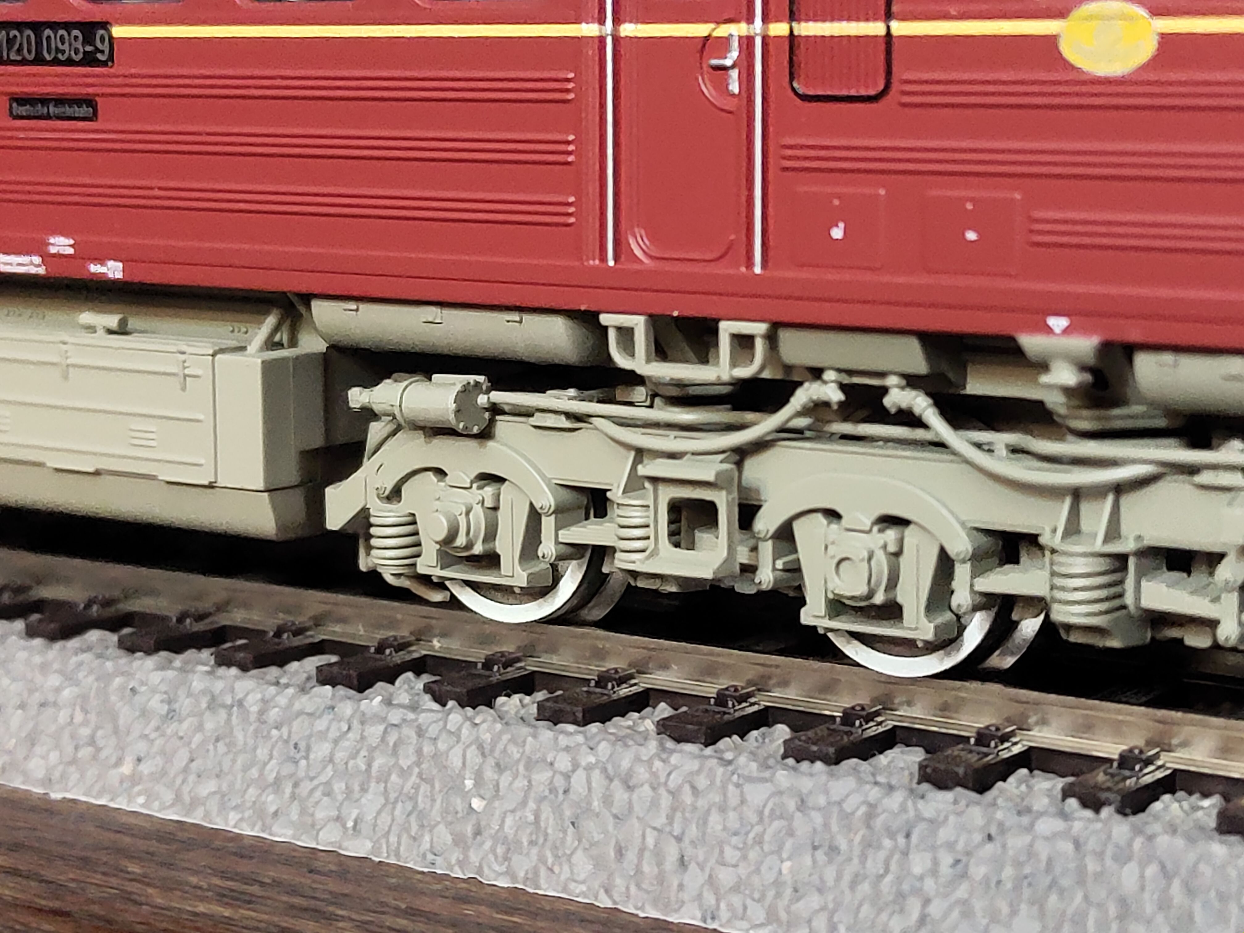 Из интересных особенностей модели можно отметить прототипично установленные буферные фонари на подвижной телеге, которые поворачиваются вместе с ней. Ну и, конечно, ярко красные колёса, которые, как по мне, делают модель по-хорошему наряднее и интереснее. По фото- и видеоматериалу, который был в распоряжении, довольно сложно судить, было ли так на самом деле, когда Е 44.5 эксплуатировались. Известно лишь, что музейный Е 44 508, находящийся во Фрайлассинге, тоже с колёсами выкрашенными в красный.