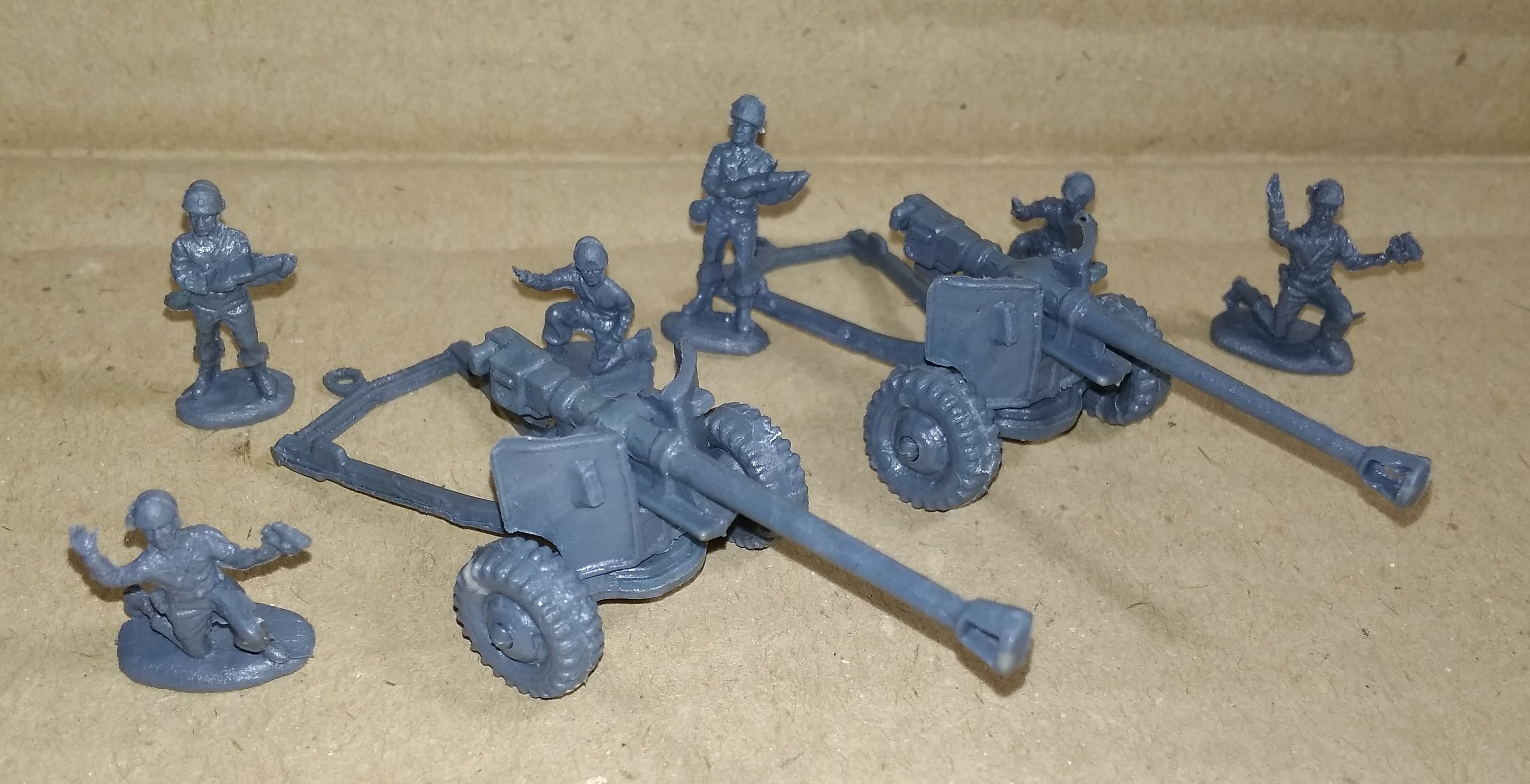Купили внуку солдатиков, играть. И попалось там среди фигурок 72-го масштаба (25мм) две пушки с расчётами. Фигурки около 20 мм, что прмерно соответствует 87-му масштабу. У пушек стволы поднимаются, колеса вращаются, станины поворачиваются относительно оси колёс. В принципе, если чуть доработать и покрасить, можно ставить на платформу или диараму. Когда игрушка внуку надоест, займусь, если они к тому времени уцелеют.