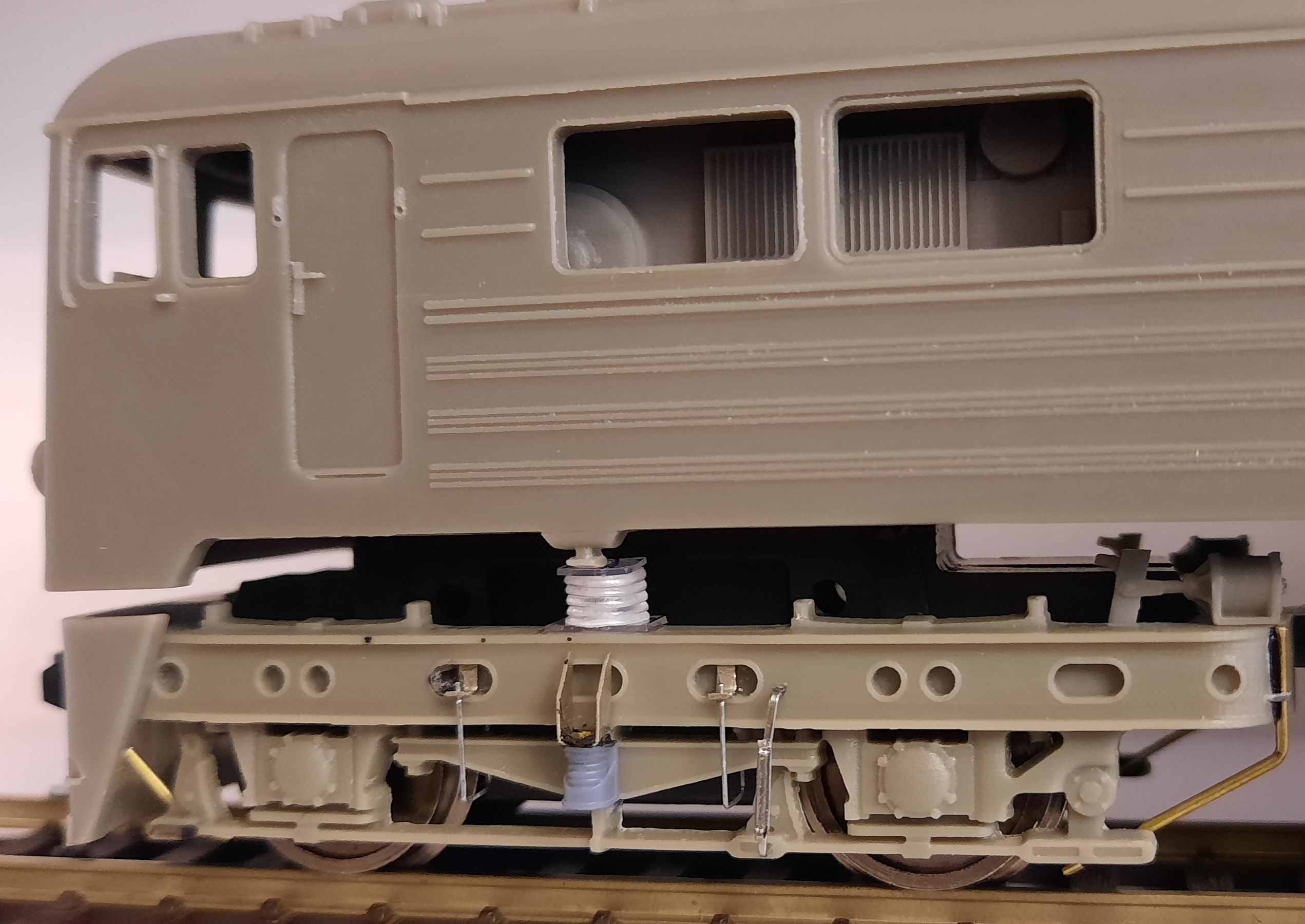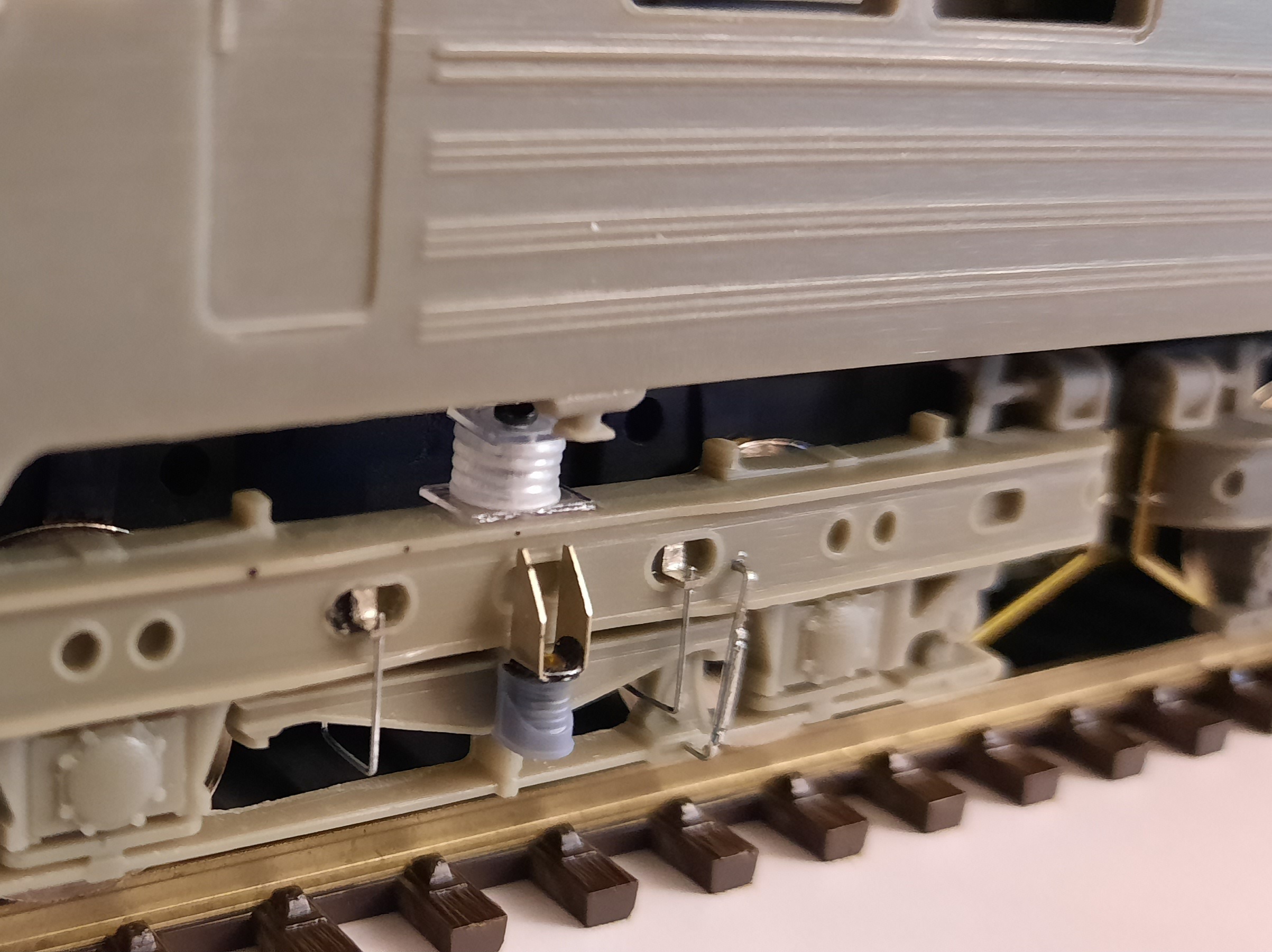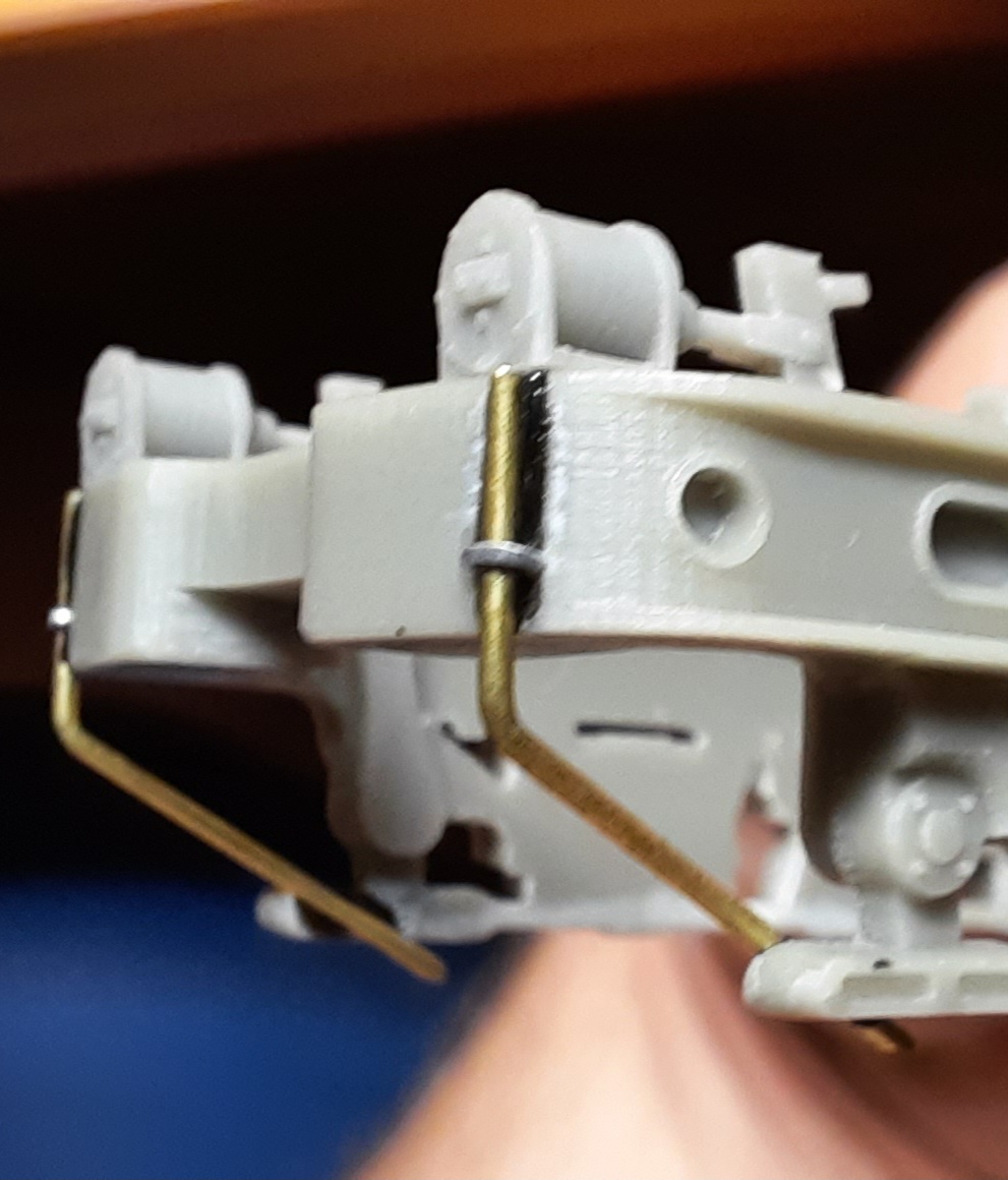 Зробив імітації кріплення шлангів подачі піску та штіфт для зчеплення секцій. Конструктивно на моделі знизу просто прикручується штанга з обох сторін, але це незручно, бо весь електровоз у постійному зчепленні. Зараз можна просто "накинути" другу секцію на першу, секції окремі.