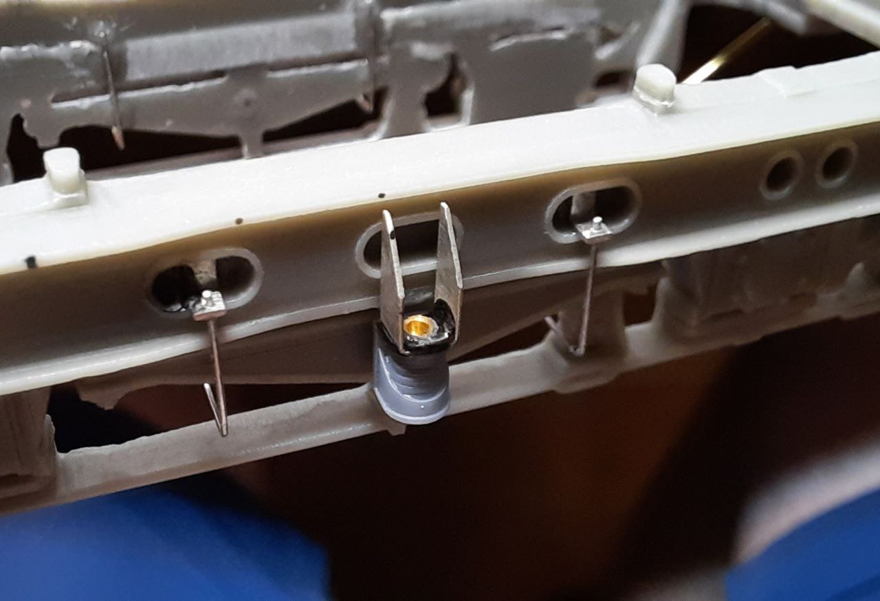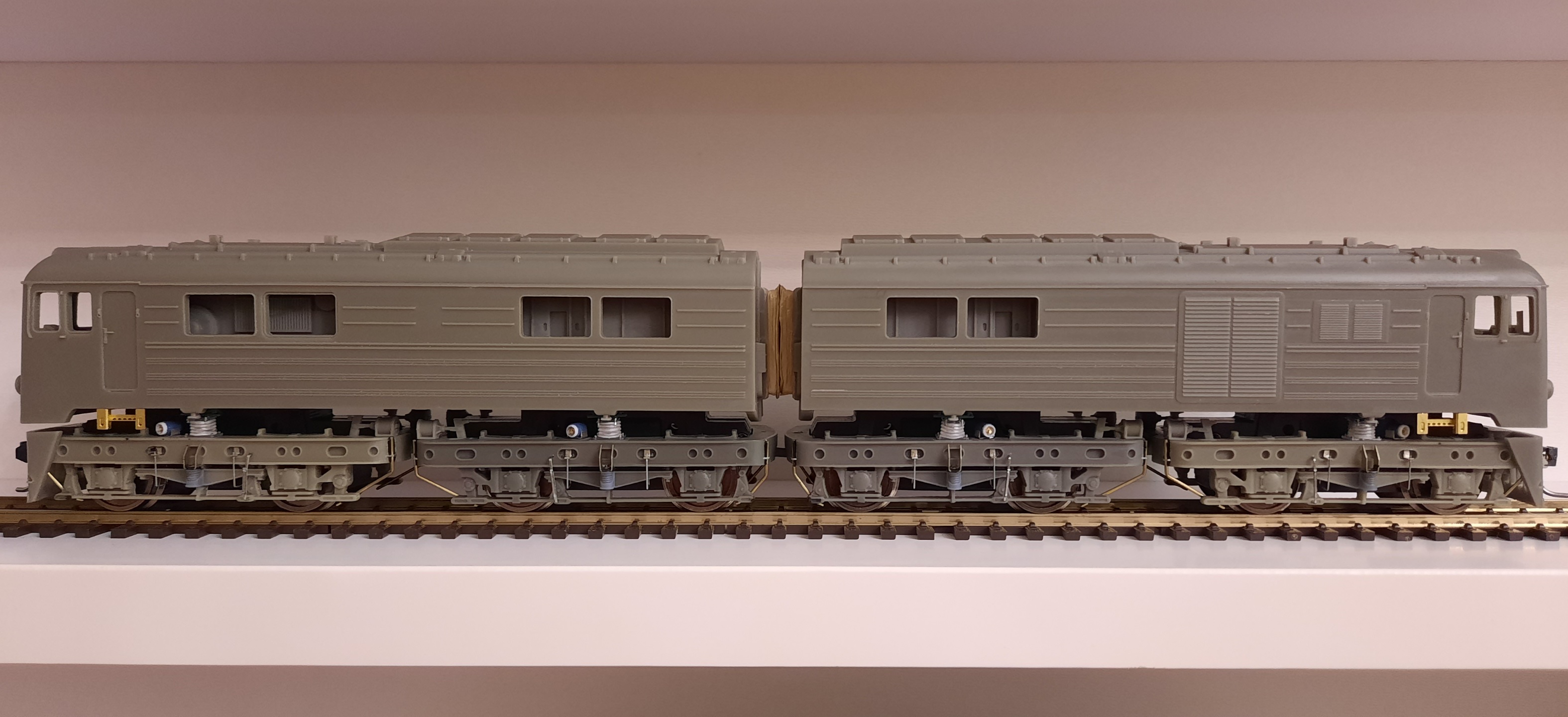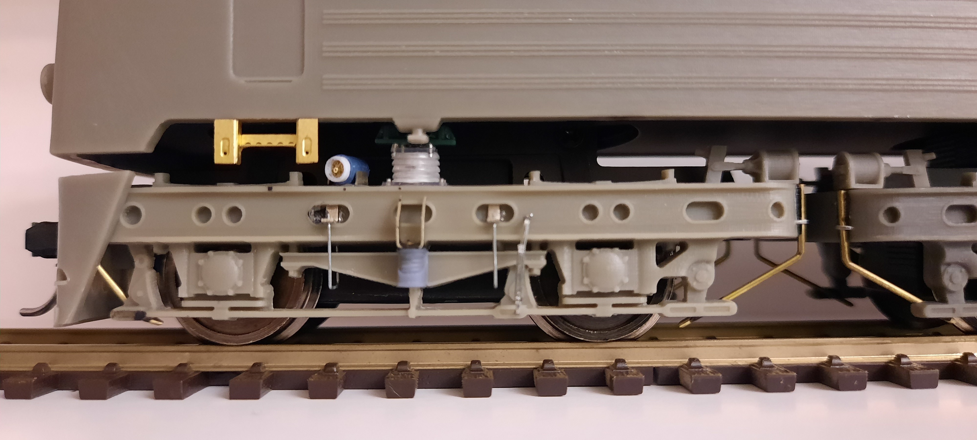 Зробив імітації кріплення шлангів подачі піску та штіфт для зчеплення секцій. Конструктивно на моделі знизу просто прикручується штанга з обох сторін, але це незручно, бо весь електровоз у постійному зчепленні. Зараз можна просто "накинути" другу секцію на першу, секції окремі.