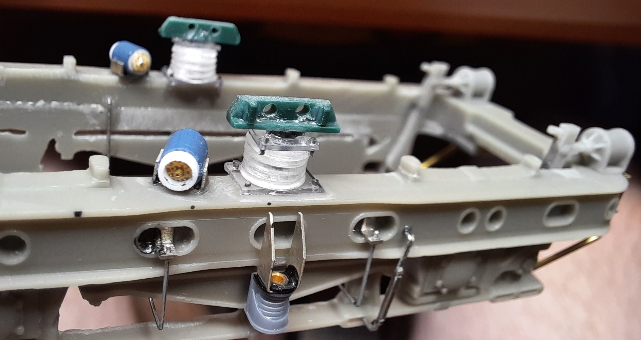 Ще доробив тяги, котрі йдуть до шкворнів. Все, з візками вже досить возитись: наразі всі помітні елементи у спрощеному вигляді присутні.
