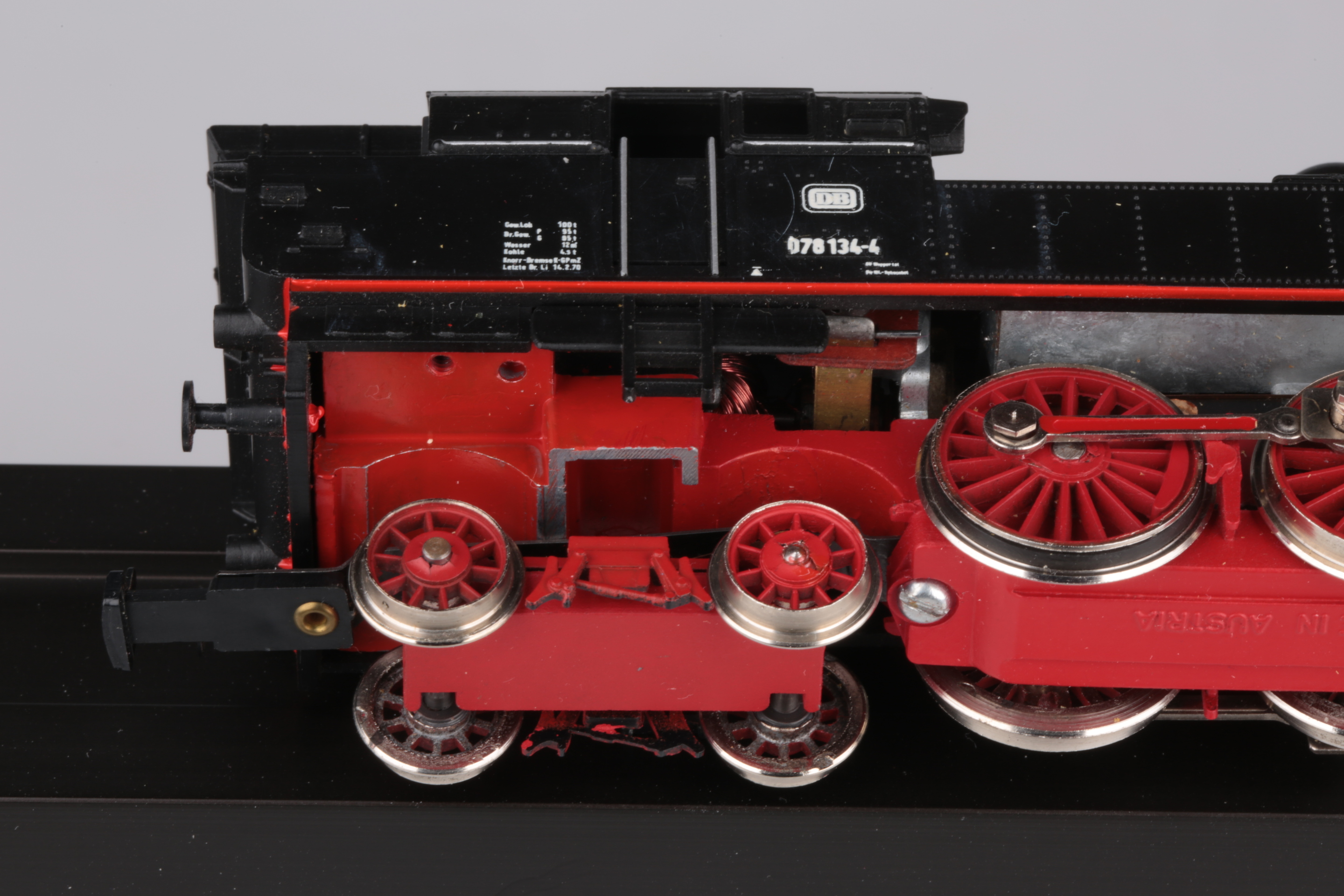 Характерные особенности: отсутствие редуктора,привод осуществлен с помощью фрикционных резиновых колец ,соединяющих валы 2-х электромоторов с 4-мя колесными парами, отсутствие иммитации топливного бака и упрощенное остекление.