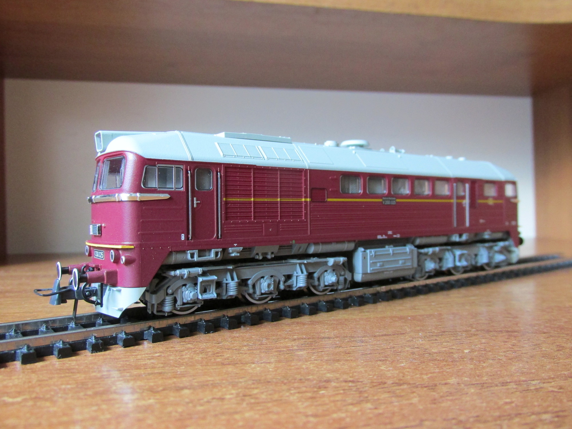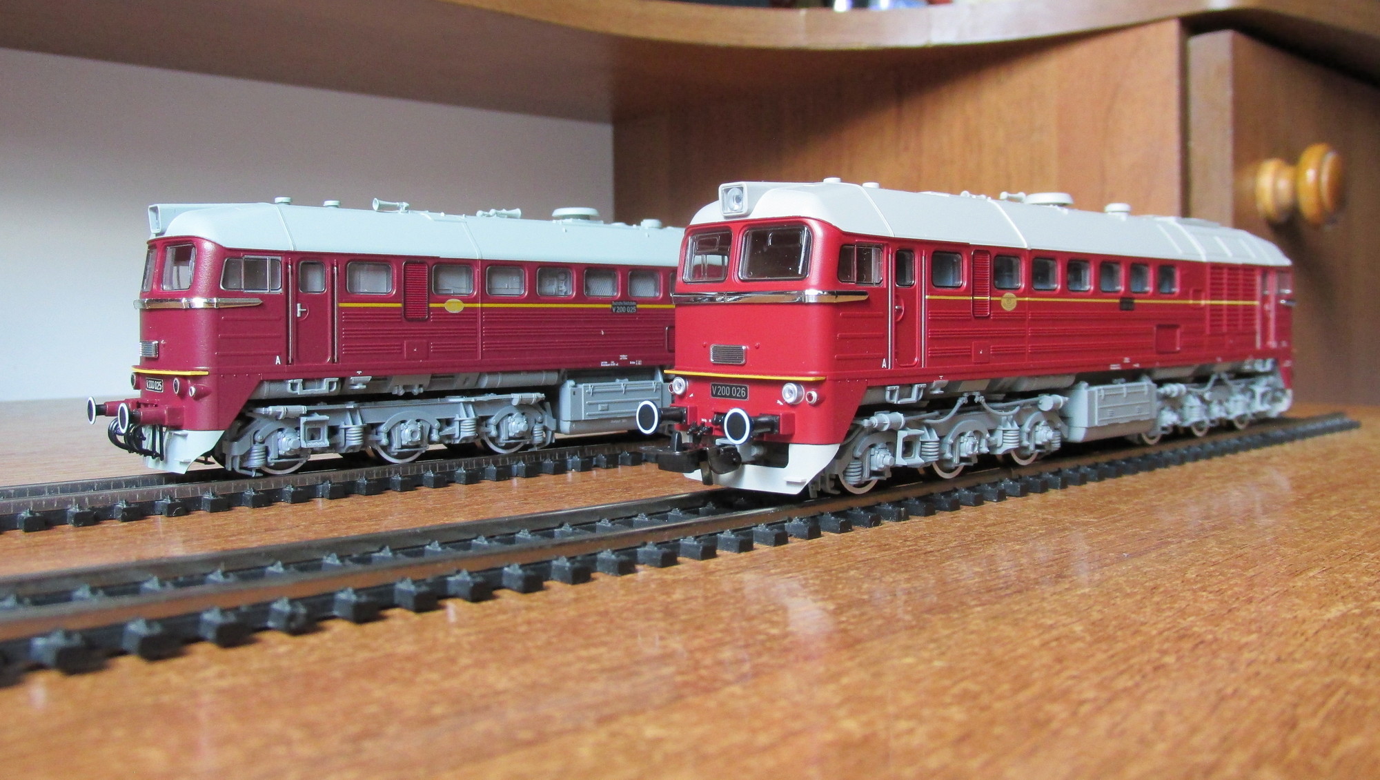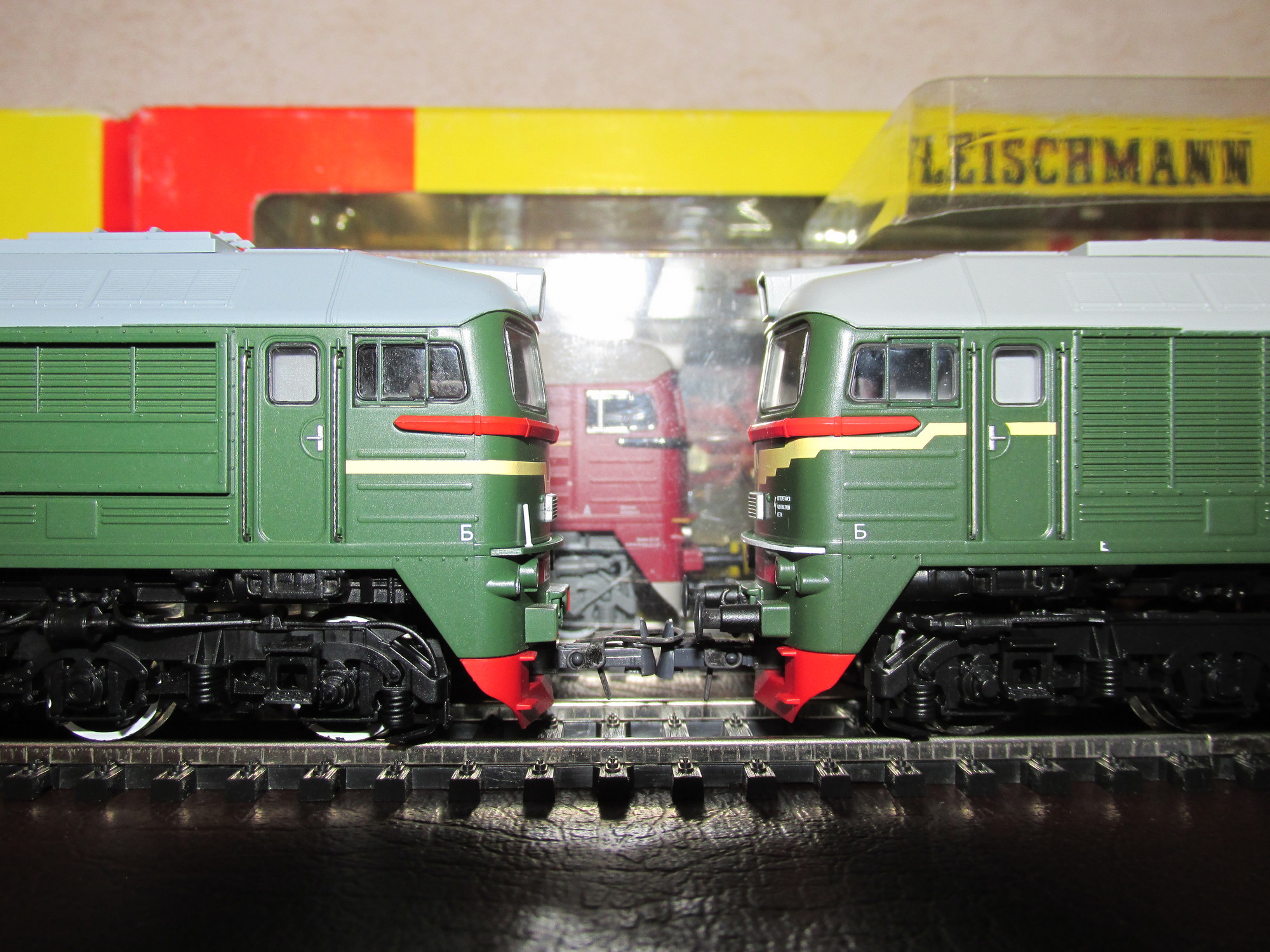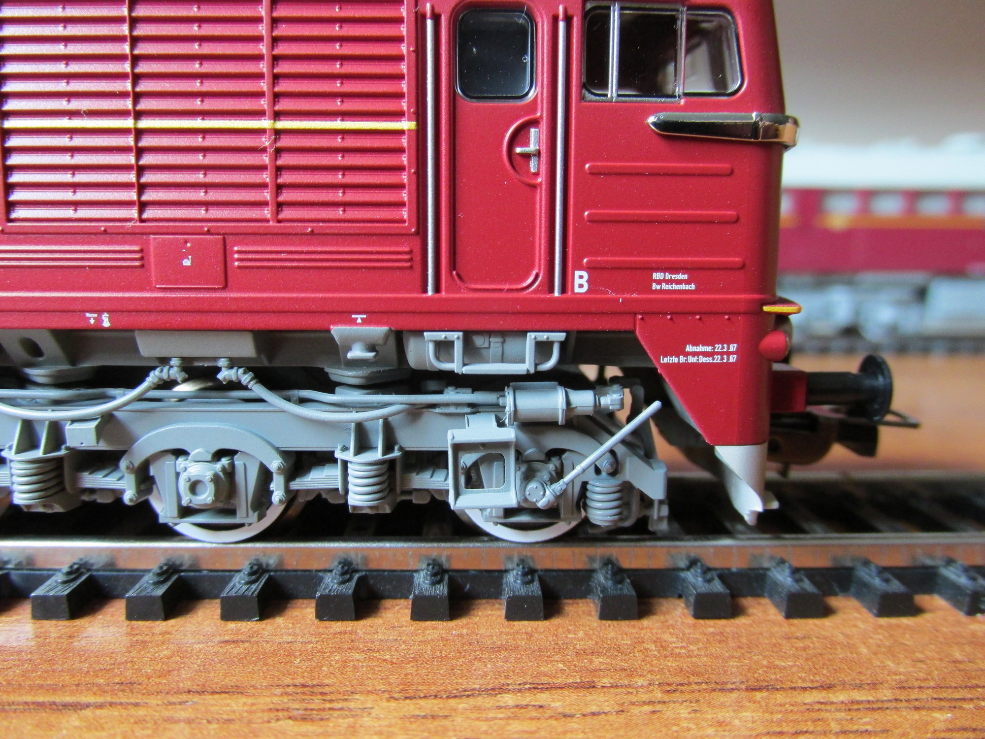 По основным моментам трудно не согласиться. Тележки выполнены очень хорошо. У Роковской модели тормозные колодки с башмаками, действительно, находятся несколько снаружи поверхности катания колёс. У PIKO они на месте. От себя добавлю: у ROCO несколько грубее рифление ступеней подножек, усеченные по верху тормозные цилиндры и отсутствуют песочные рукава от форсунок песочниц до песочных труб (хотя сами форсунки и песочные трубы с наконечниками есть). У PIKO цилиндры полноразмерные и песочные рукава на месте. Трубопроводы к тормозным цилиндрам выполнены более аккуратно и имеют круглое сечение. Ещё на модели PIKO присутствует механический привод скоростемера, которым оборудовались первоначально все тепловозы V200 (BR120). Подножки на кузове у ROCO тоже заметно грубее, у PIKO они более проработаны. Насчёт прожектора и буферных фонарей, мне кажется, что у Роковского тепловоза они сделаны лучше, смотрятся естественней. Интерьер кабины у ROCO тоже лучше. А вот имитация дизельного помещения лучше у PIKO - когда смотришь, действительно кажется, что между дизелем и стенкой есть проход. Хотя, когда смотришь на окно аппаратной камеры, эффект обратный - элементы каркаса, на которых монтируется электрооборудование у тепловозов типа М62 располагаются вплотную к окну. Теперь рассмотрим крышу. Первое, что бросается в глаза - решётка над вентилятором шахты холодильника. У ROCO она намного грубее, а у PIKO выполнена на более высоком уровне - перемычки намного тоньше, а через ячейки хорошо просматривается колесо вентилятора. У ROCO странное и непонятное расположение тифонов на крыше. Просмотрев множество фотографий прототипов, я ни на одном из них не увидел подобную схему размещения трёх тифонов на крыше. У PIKO, опять же, с тифонами всё в порядке и достоверно. Оба тепловоза выполнены в варианте без глушителя. У PIKO сымитированы предохранительные сеточки на выхлопных патрубках, у ROCO просто отверстия патрубков - выглядят угрожающе. Ещё можно заметить, что декоративные решётки на кабинах тепловоза от PIKO выполнены со скругленными краями, как и должно быть. Впоследствии, при прохождении тепловозами капитальных ремонтов, эти решётки заменялись стандартными, более угловатыми, но при этом тепловозы также получали самодельный крышевой глушитель. У Роковского тепловоза решётки уже более позднего типа, а глушителя нет - опять несоответствие. Но вернёмся на крышу. У PIKO на крышевом блоке с кузовным вентилятором и тифонами имеются три продольные гофры. У ROCO на этих блоках гофров нет вообще. Пришлось просмотреть немало материала, чтобы установить истину - на фото прототипа V200 026 слабо, но видно, что эти самые три гофры есть. Ну а это видео развеевает все сомнения: https://www.youtube.com/watch?v=7dE75FdSGQU Пусть на нём тепловоз наш М62, но подобные детали у них были унифицированы с экспортными. Насчёт цвета кузова можно спорить долго, но при просмотре фотографий прототипов видно, что машины неоднократно перекрашивались и цвет менялся от ярко-красного до тёмно-бордового. У тепловоза PIKO, крыша действительно имеет чуть бежевый оттенок. Фото прототипа V200 085 наглядно подтверждает, что новые тепловозы имели крышу серо-бежевого цвета и экипаж чисто-серого. Однако, цвет кузова чуть темнее - ближе к Роковской модели.