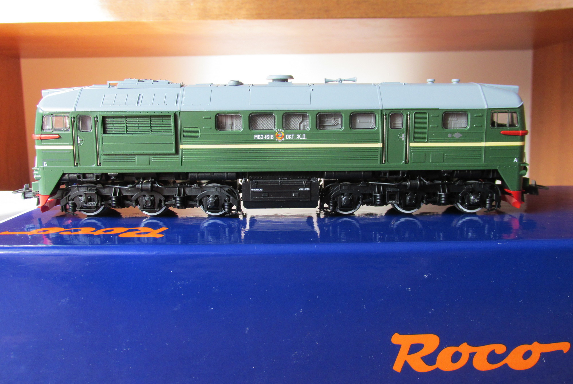 Правду говоря, ещё при просмотре фото анонсируемой модели на сайте ROCO, было видно, что тепловоз опять будет с косяками, но всё равно, решил взять. Присмотримся к модели поближе. Первое и главное несоответствие видно сразу: тепловоз выполнен в варианте без глушителя, но при этом имеет бортовой номер 1616. Как известно, все тепловозы М62 с номера 1361 имели крышевой глушитель. Фото прототипа тоже нашлось, на нём хорошо видно, что тепловоз номер 1616 с глушителем. Конечно, можно предположить любую легенду, от банальной перебивки номеров до замены крышевого блока во время ремонта (такое было, например, с тепловозом М62-1473, которому установили крышу от более ранней машины - фото прилагается), но чем руководствовался производитель при проектировании модели? Непонятно. Тем более, фото прототипа, на котором тепловоз с глушителем, сделано в 2006 году и это лишний раз подтверждает, что машина не была подменена более ранней, то есть перебивки номеров не было. Мы же имеем модель, подразумевающую тепловоз в состоянии явно до 1991 года - на боковой стенке кузова красуется герб СССР. Так что тут явная неувязка. Ещё, что вызывает недоумение - форма жёлтой полосы-птицы на кабинах, выполненная по типу 2М62. Если просмотреть фото реальных тепловозов М62, то видно, что птицы по типу 2М62 на Машках-одиночках после 1991 года стали рисовать массово. Это было и есть сейчас. Но во времена СССР, насколько я помню, такого не наблюдалось! Все М62 имели оригинальную ступенчатую птицу, которую рисовали на ремонтных заводах согласно стандарту. Несмотря на вышеперечисленные косяки, модель имеет такие правильные и приятные детали, как верхние жалюзи холодильника и два тормозных цилиндра на тележку. Хотя, рамы тележек так и остались с конструкционными элементами под двухстороннее нажатие тормозных колодок.