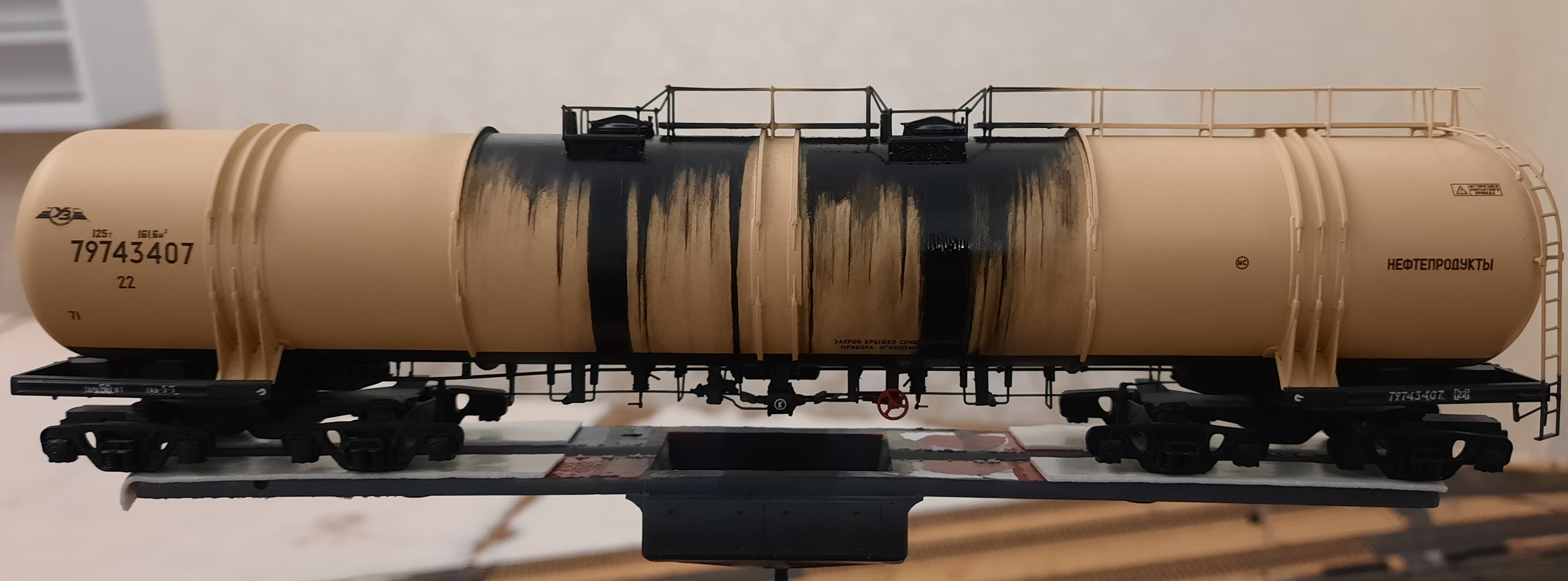 Совсем немного подкорректировал некоторые следы стекающей по котлу нефти, которые выглядели неестественно, и добавил бОльшее количество пятен и брызг. Дальше - матовый лак для фиксации масляных потёков, пигменты (эффекты припылённости). Финалом работ будут свежие блестящие потёки нефти поверх матовых старых. Сколов и ржавчины не будет: по моей версии цистерна неухоженная и немытая, но относительно недавно прошедшая ремонт.