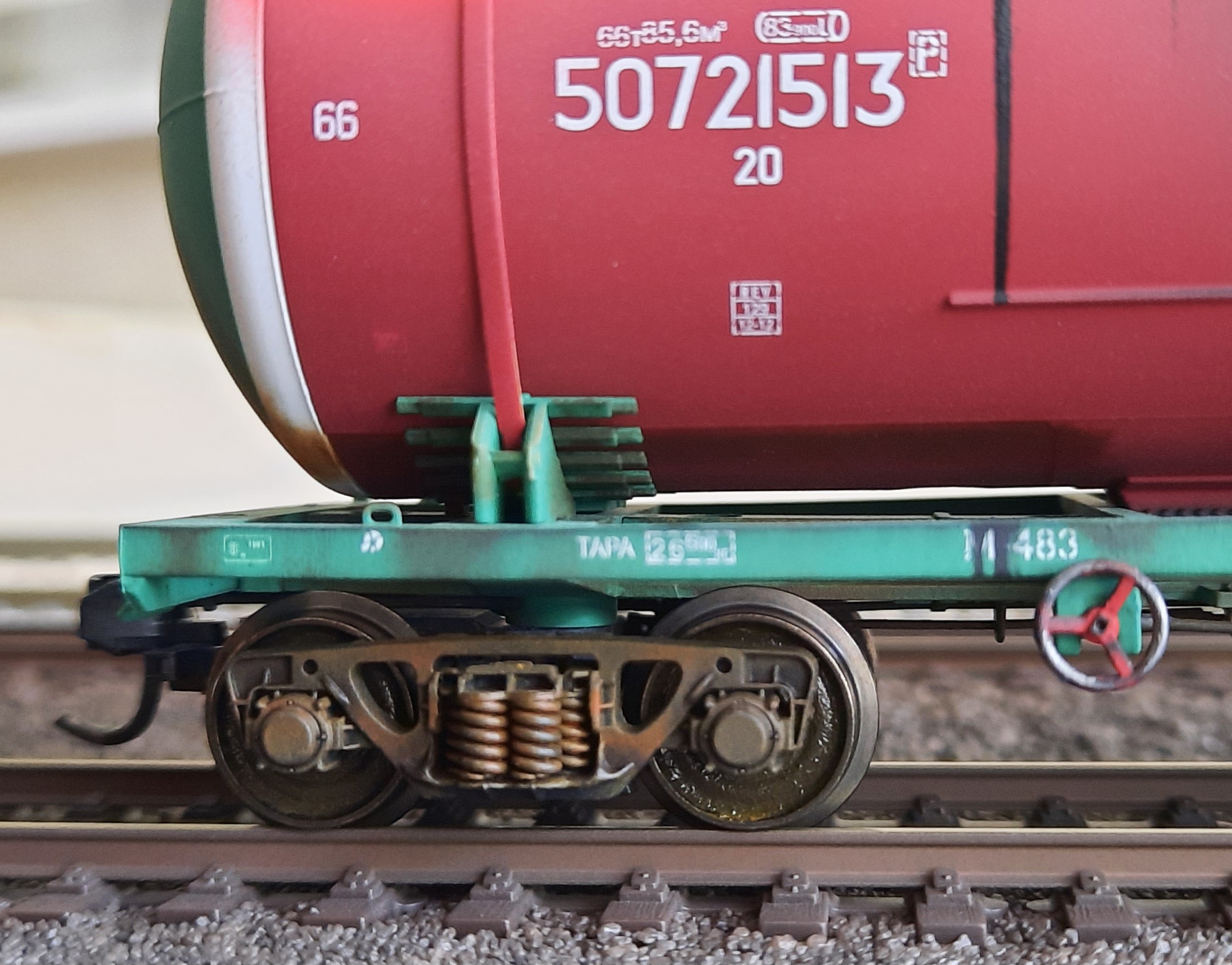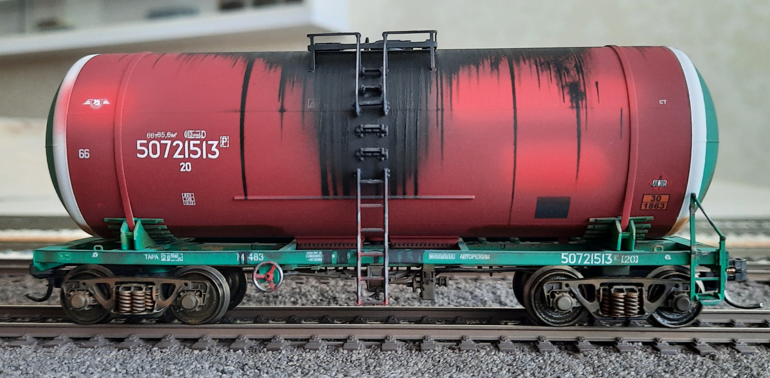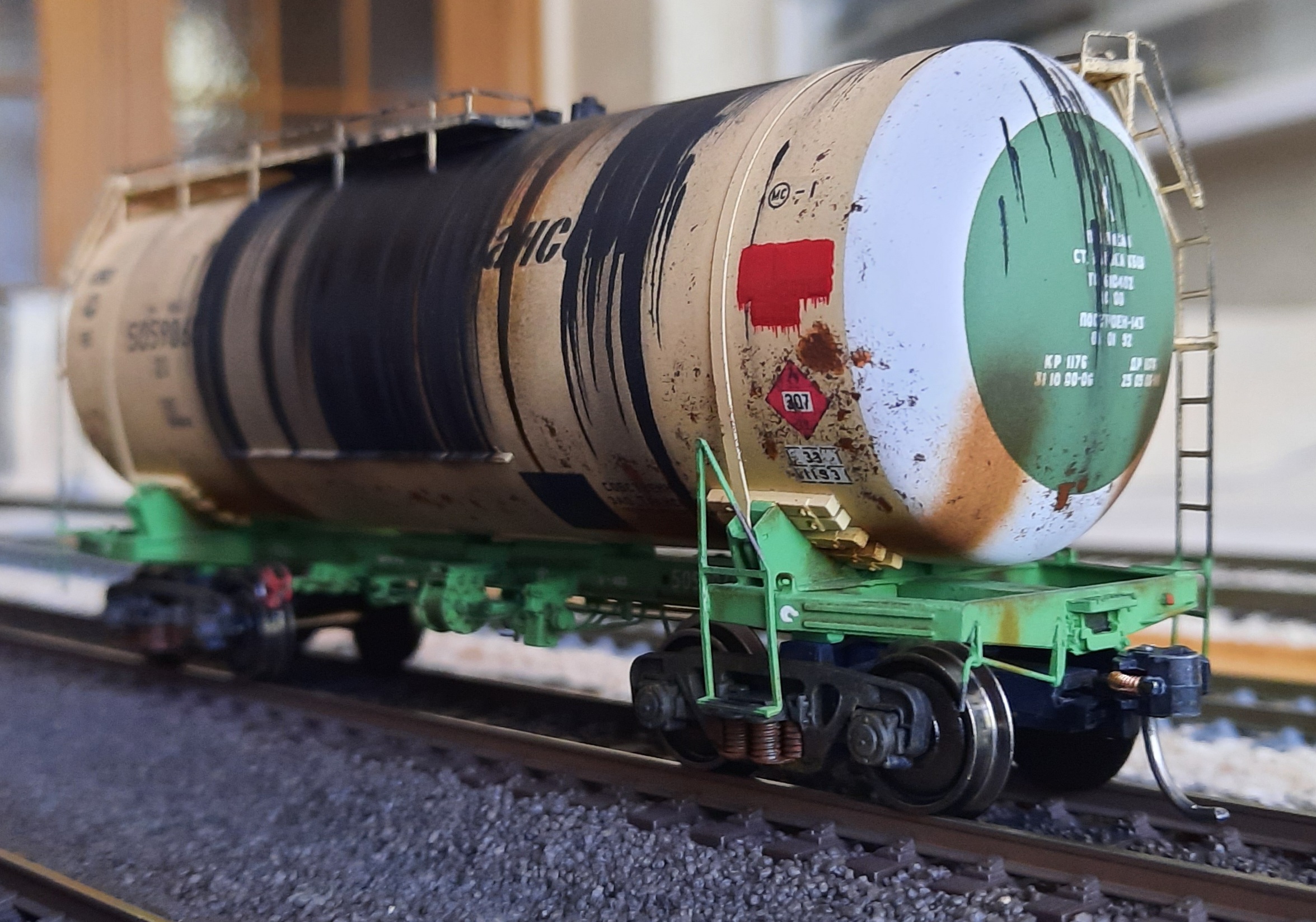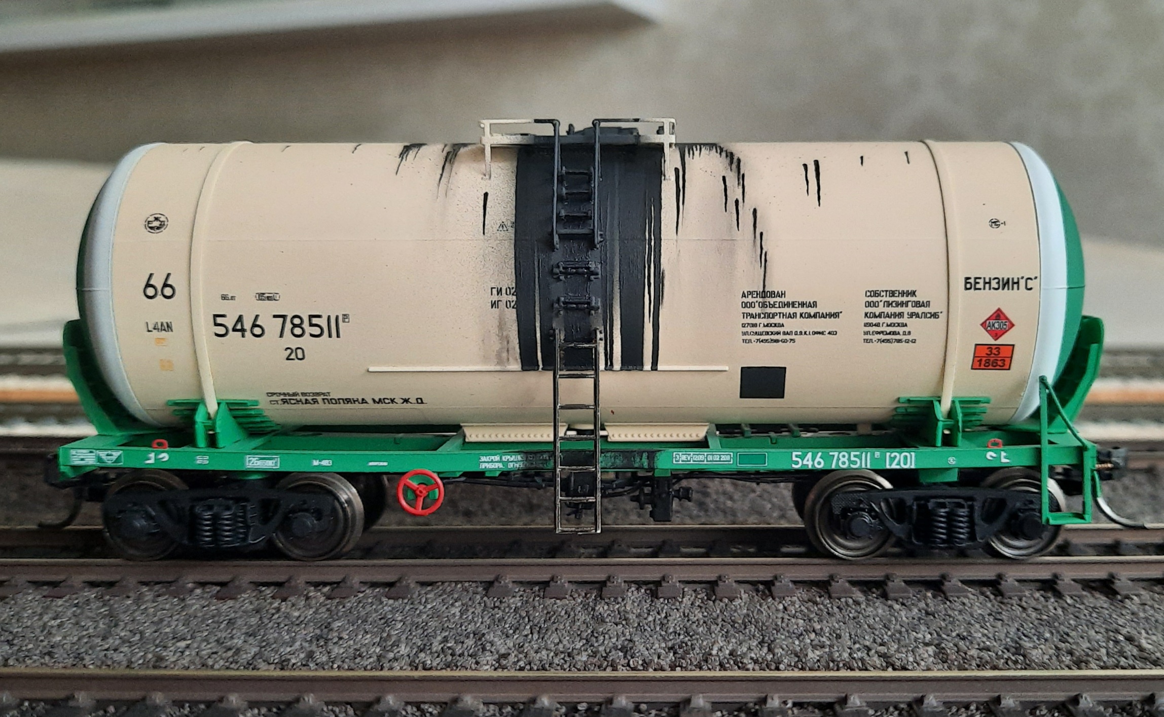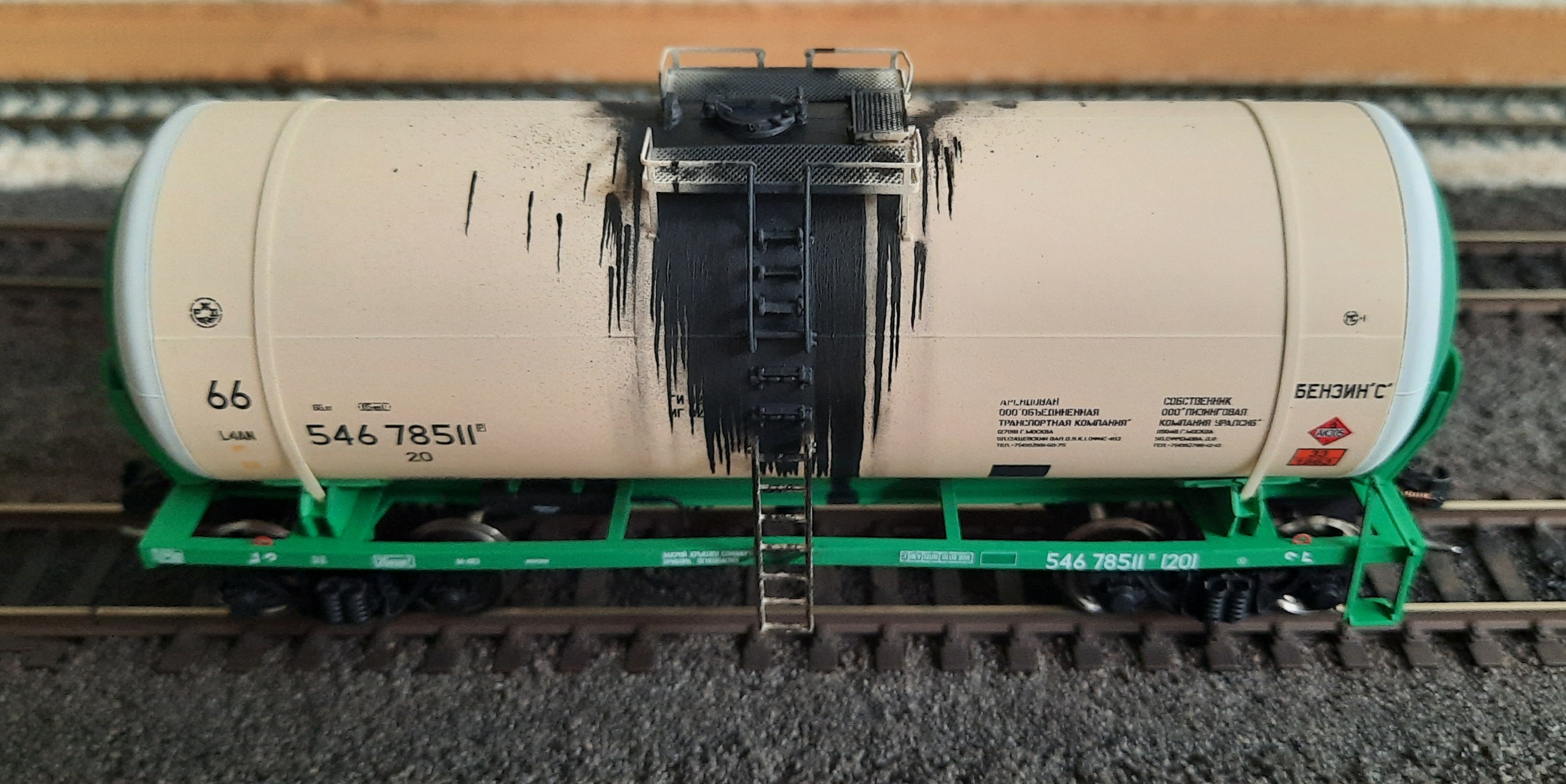 "Лінивий" везеринг: нова цистерна без слідів експлуатації, але вже вимазана під час заправок. Як модель з таким везером - нічого особливого, але згодиться мені в якості "каталки" та у масовку на макет.