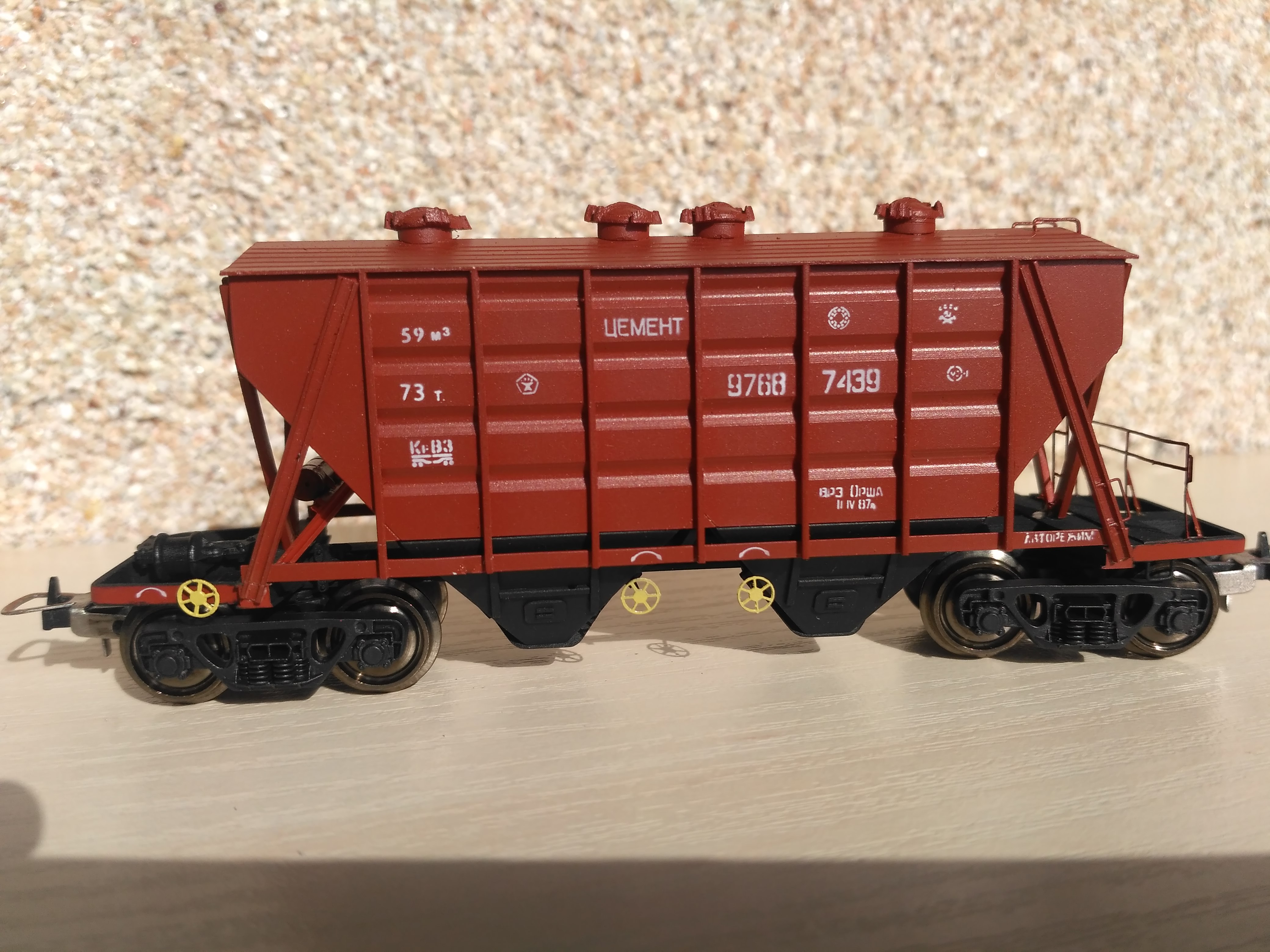 Призвавшись в ряды СА, я не смог удержаться от моделирования и к концу службы (1991г) у меня появились : дрезина АГМ и два хоппера (зерно и цемент). Красил их сразу по возвращению домой. АГМка была приводная с рабочим полиспастом, а у зерновоза были задействованы все люки ( загрузочные и разгрузочные). Было так сделано, что при нажатии на маховик привода люков они попарно открывались (разгрузочные). Потом поступили заказы и было изготовлено ещё около 15 цементников и ок.10 под зерно. Так получилось , что мой зерновоз буквально выдернули из коллекции и увезли в Венгрию , как оказалось навсегда. (как у сапожника без сапог). Вот что осталось в память...