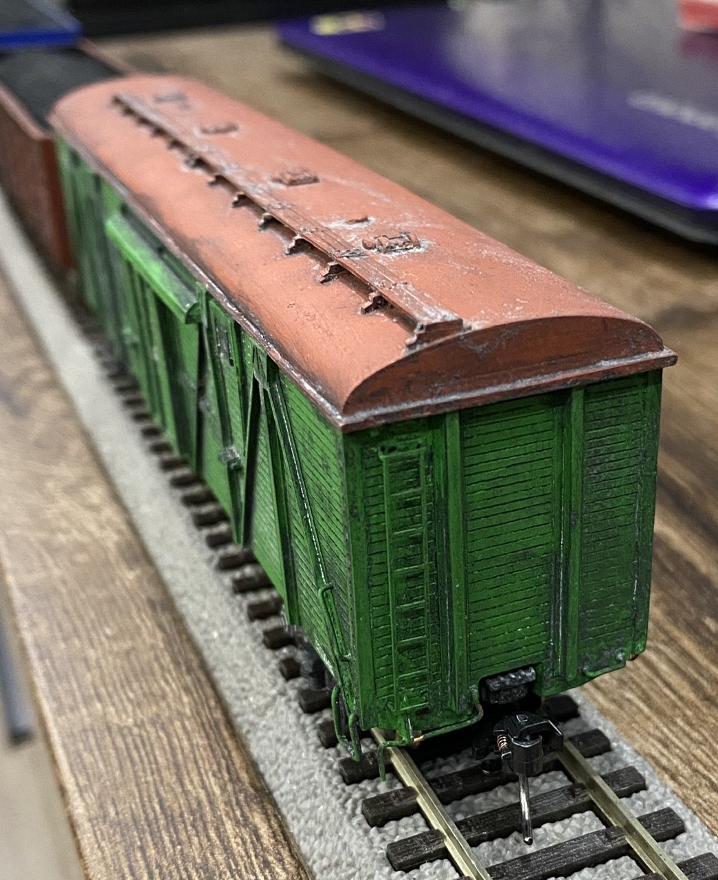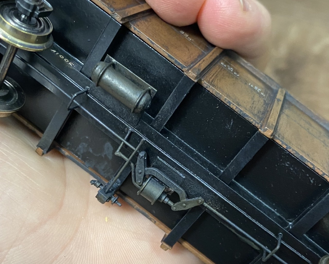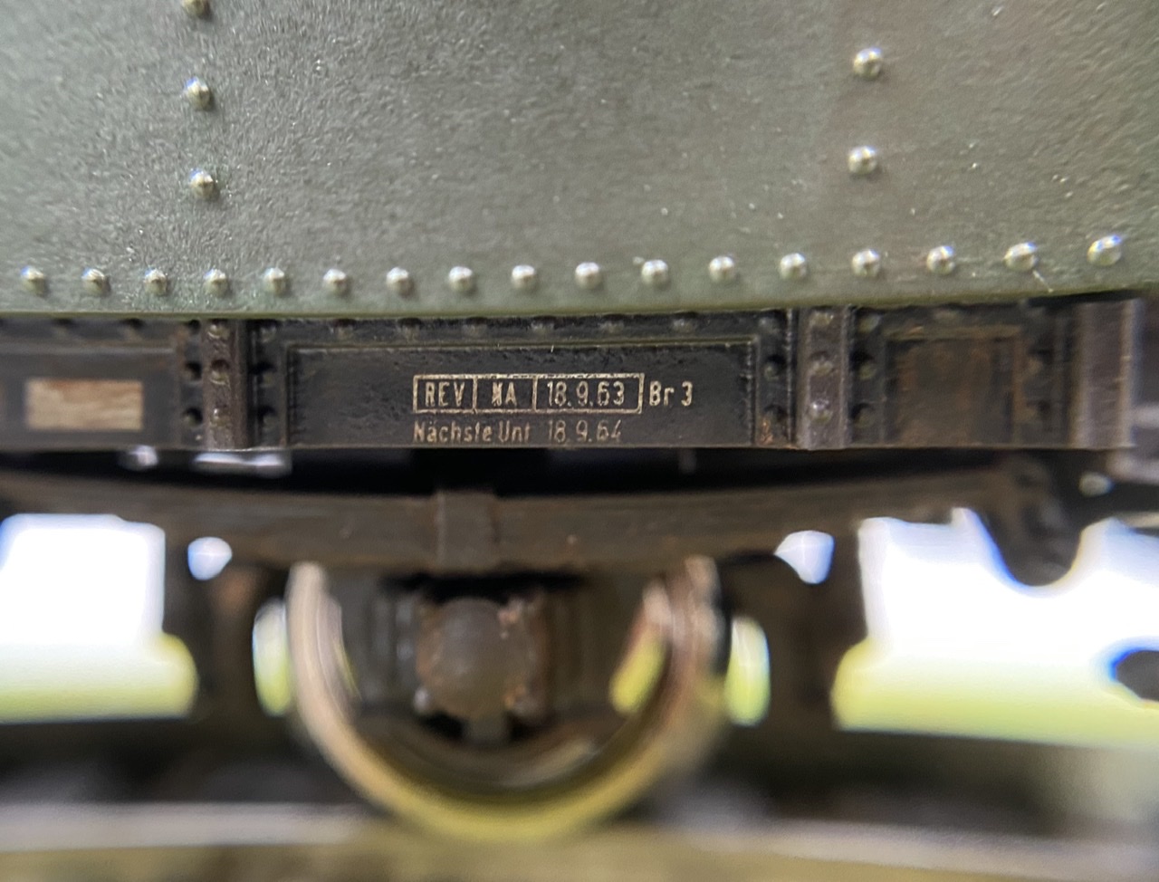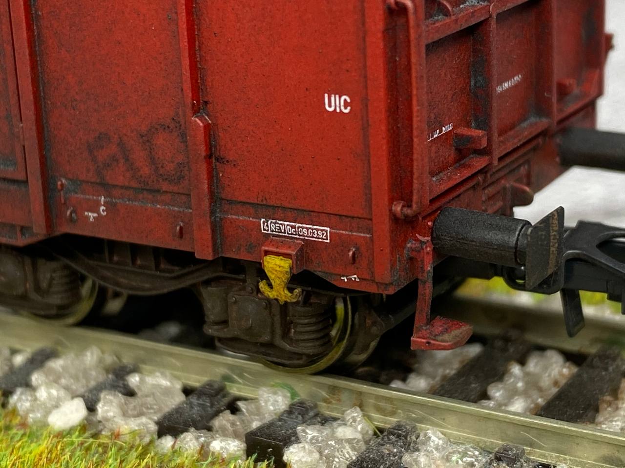Нижня частина теж оброблена рудою тінню, нанесено лак, та пігмент імітацію іржі. Після лакування на корпус додана імітація забруднення та іржавих підтіків, рами вікон вирішив на чіпати зовсім, залишивши деякий «шарм» німецьких вагонів