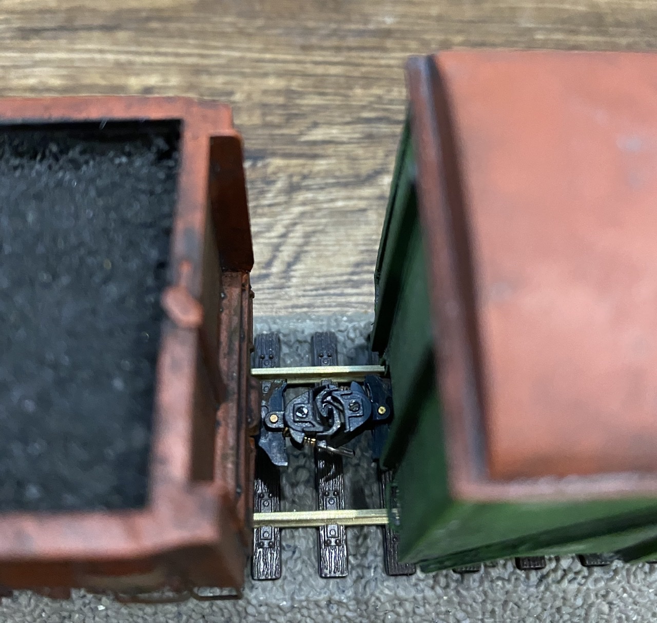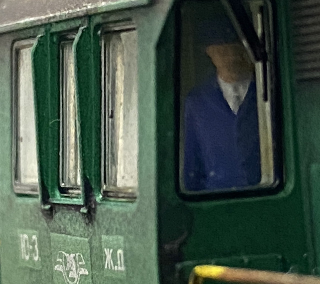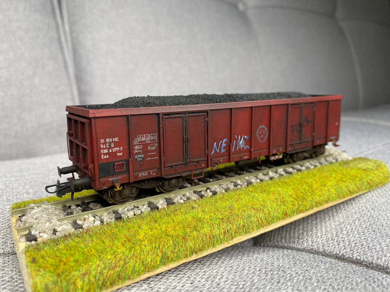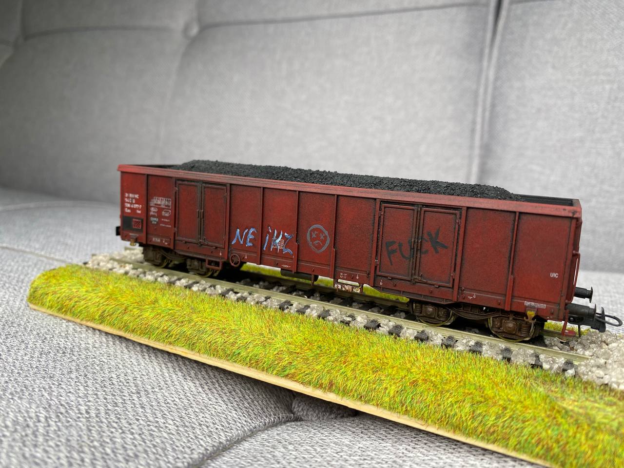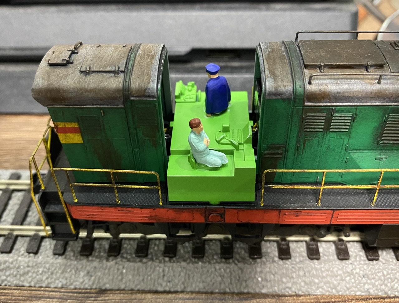 На чмуху почав встановлювати освітлення від viessmann, а в салон чмухи посадив двох працівників по різні сторони кабіни. Крім того до складу додано ще один напіввагон із вугіллям, зчепки kadee #18