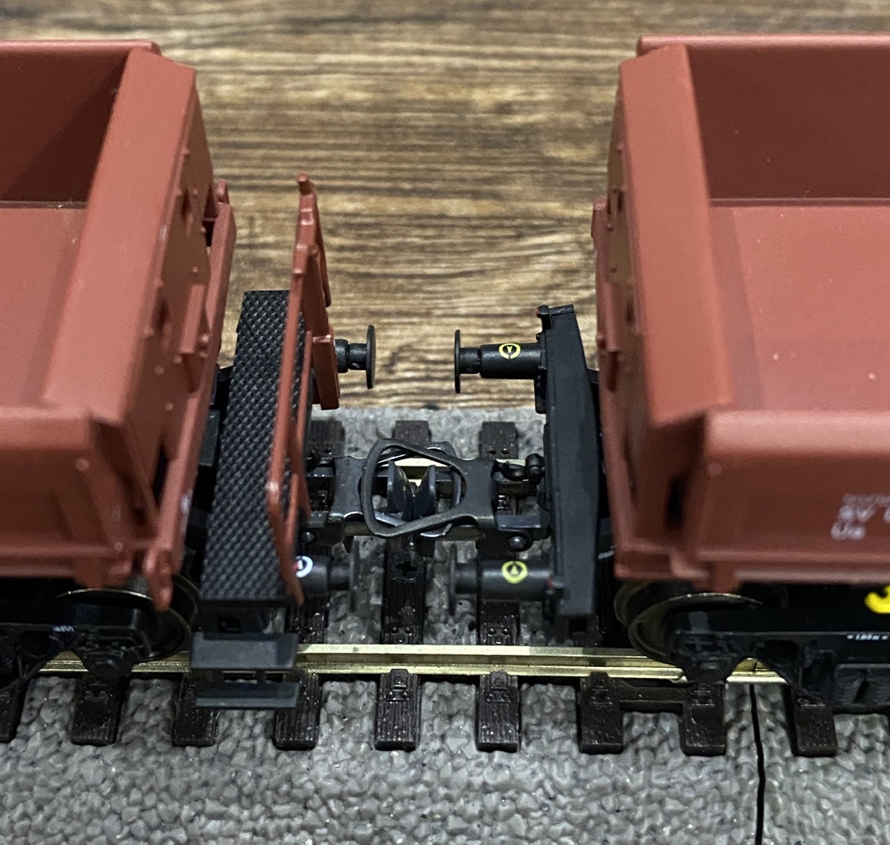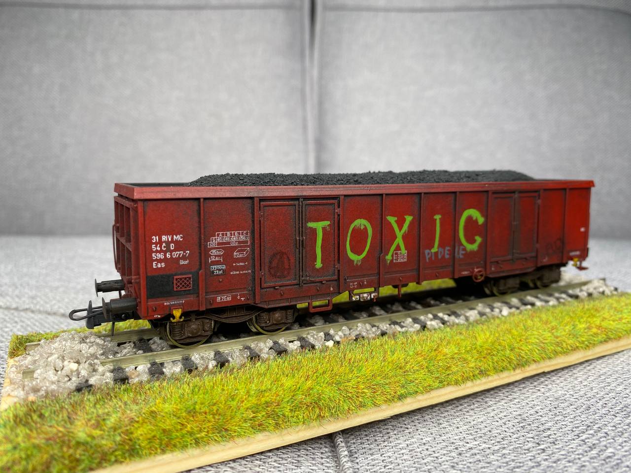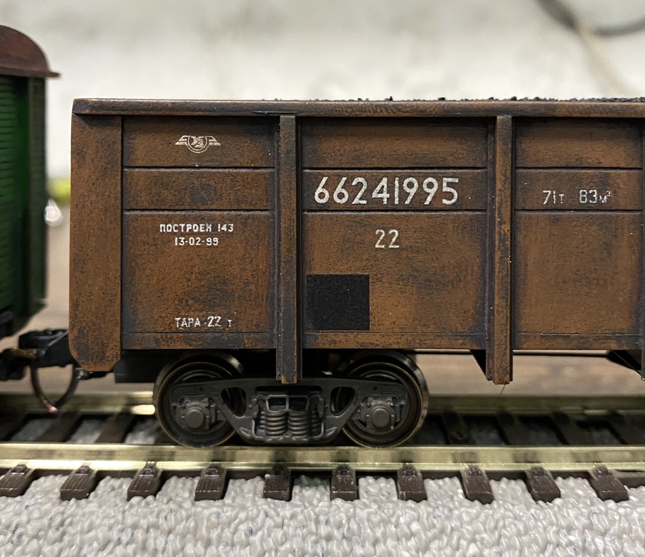 Нанесений везерінг та сильні сліди тривалої експлуатації. На вагонах встановлені зчепки Kadee #18 та #19 відповідно до довжини NEM-шахти. Вагони виглядають досить колоритно поряд із замурзаним ЧМЭ3