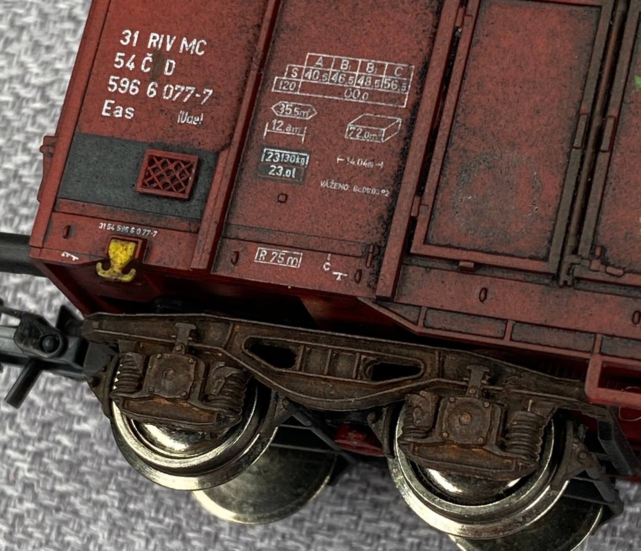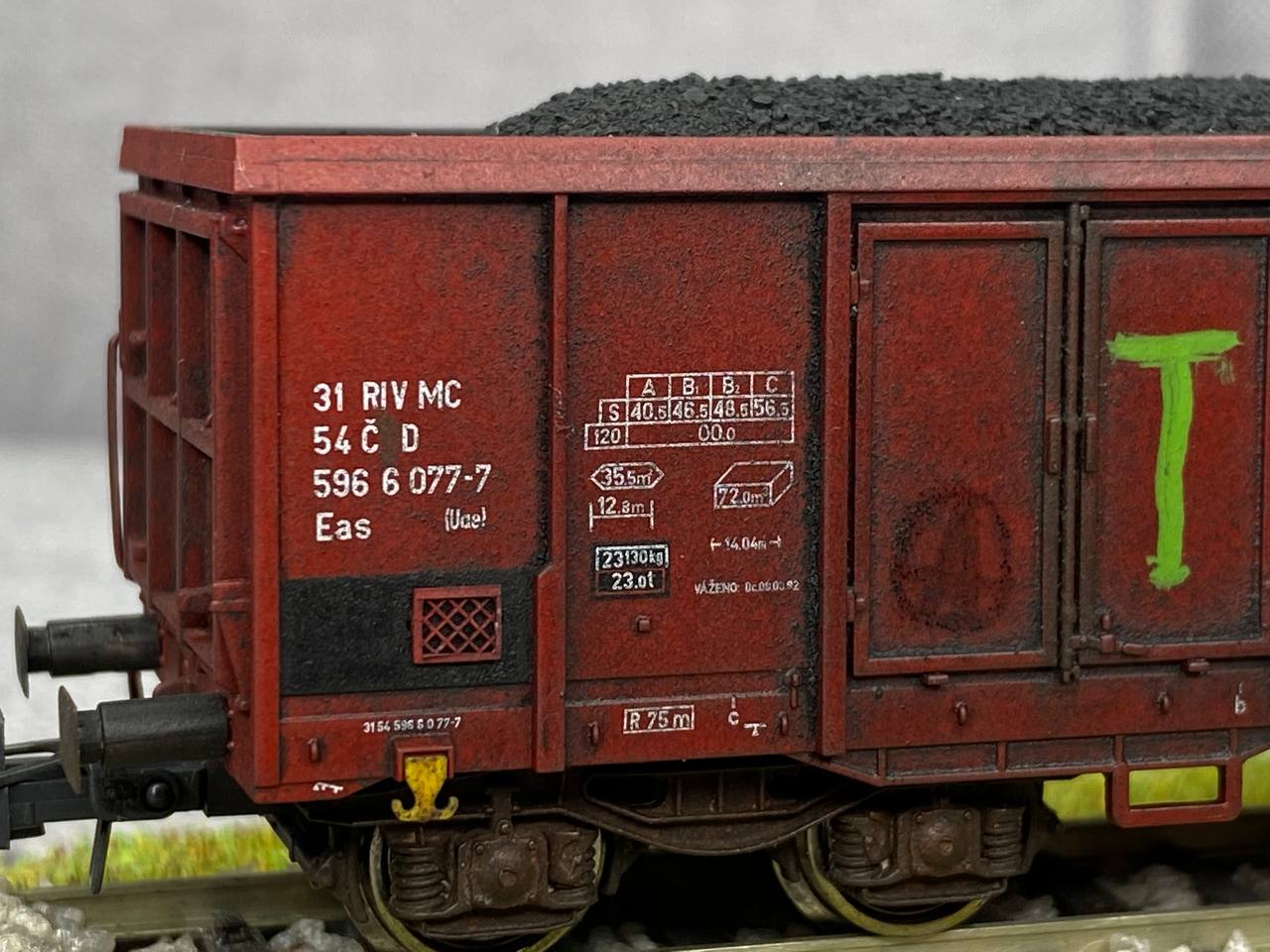 Цікавий везерінг. Більше за все емоцій виклакила одна деталь: замазана буква "S" із "ČSD". Стовідсоткове попадання! Хоч ніколи й не бачив такого у сучасних надписах, що нанесено фарбою, але переважна більшість вантажних вагонів у Чехії й досі мають щось незрозуміле на табличках та рамах, тобто "Č*D" або "Č D". Та й деякі пасажирські...