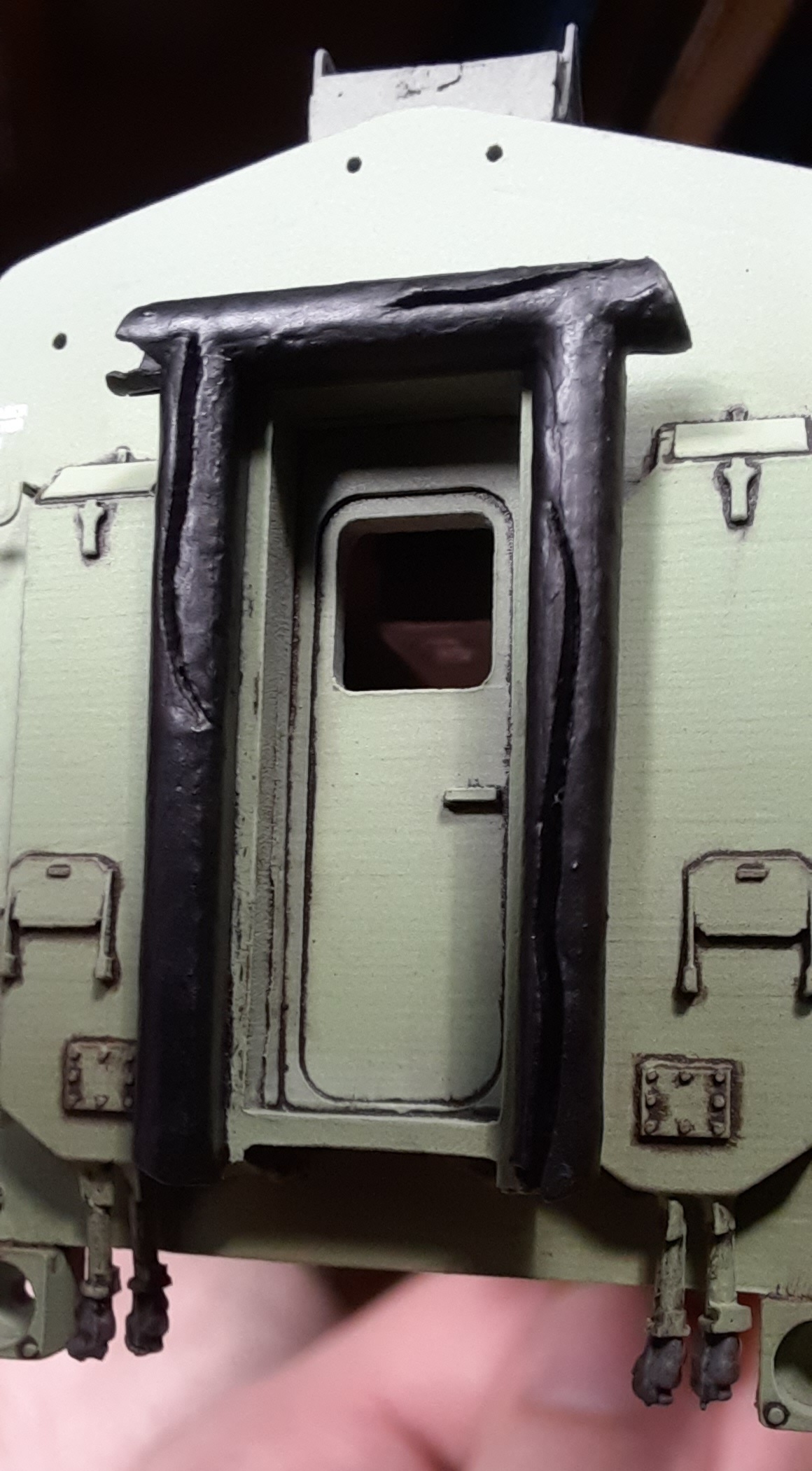 А я тем временем понемногу продолжаю 116-й тепловоз. Имитацию резинового суфле делал из родной детали набора, предварительно наковыряв канавки скрайбером (типа имитация порванного суфле). Красил кистью густой чёрной матовой краской, чтобы неровная поверхность больше напоминала резину, нежели пластик.