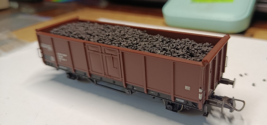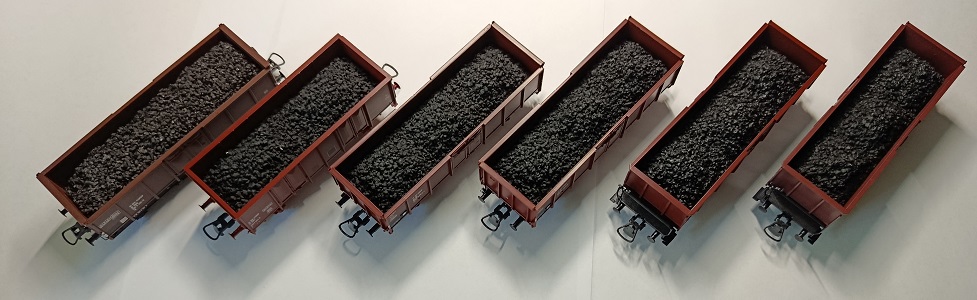 Невеличке поповнення. Напіввагони типу Е (Omm) завантажені вугіллям. Набір Roco, нажаль неповний. В комплекті, окрім вагонів DB та одного SNCF, ще повинен бути вагон CFL, але не склалося. Довелося замінити його вагоном від Liliput приналежності ÖBB. Вагон не був завантажений вугіллям. Завантажив сам.