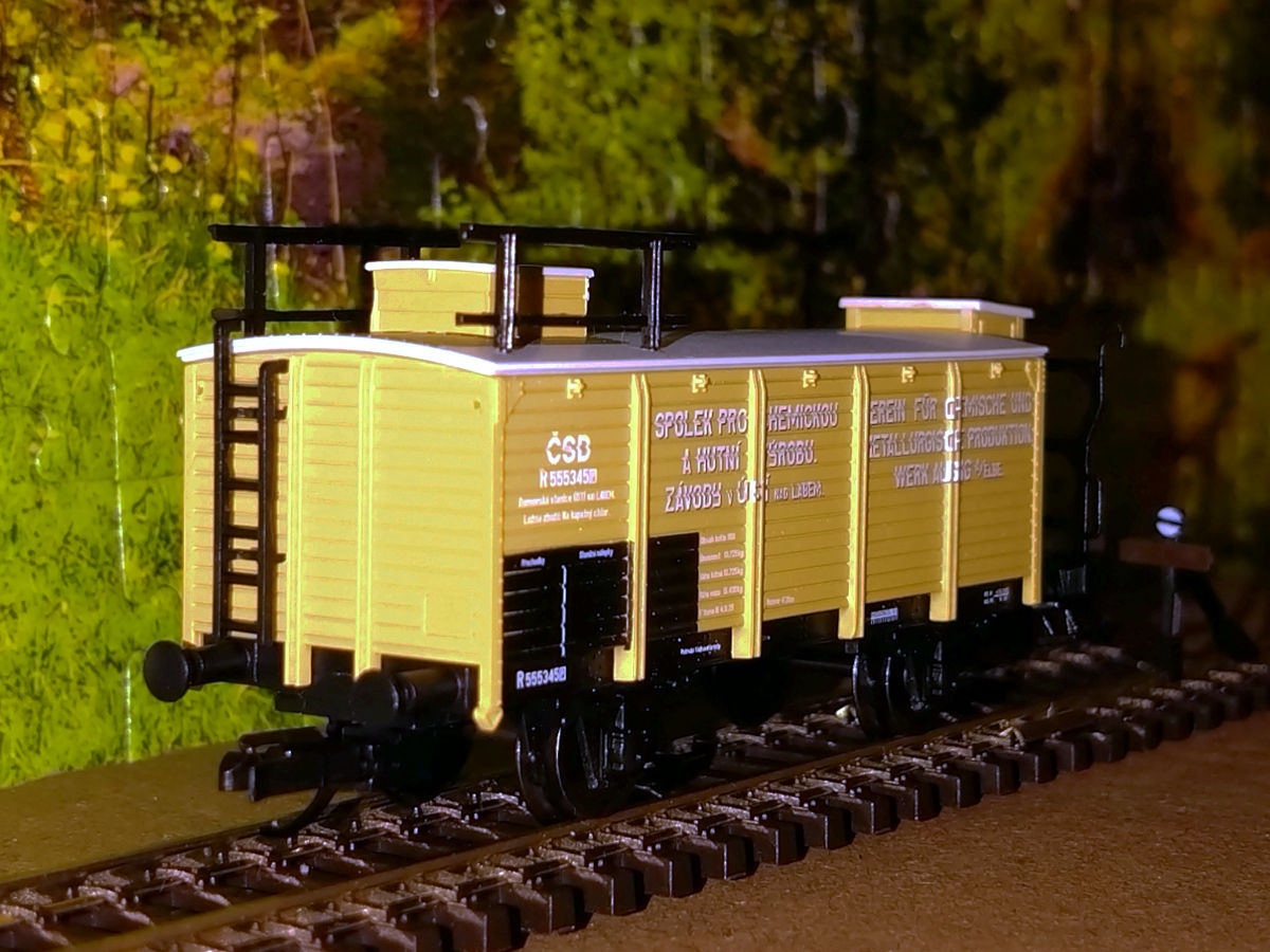 У сонячному світлі модель виглядає яскраво, можна роздивитися всі надписи: чеською та німецькою мовами - бо Судетська область мала значну кількість німецького населення. Назва власника написана великими літерами з кожного боку. На рамі дата огляду - 4.9.25, тобто з першої серії, вантаж - рідкий хлор, кольор прототипу - слонова кістка (мабуть, Тілліг трохи помилився, коли зробив цистерну досить яскравого жовтого кольору, але, знов-таки, інформації щодо таких цистерн замало, тому помилка не така вже й груба). Із штучним освітленням цистерна виглядає теж яскраво, але роздивитися білі літери на жовтому тлі трохи складніше. А ось із товщиною металевих елементів у масштабі не дуже.