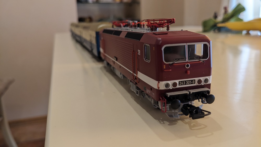 Один из первых локомотивов которые купили, "Людмила" фирмы Марклин переделанный под обычные рельсы. Выбор был очевидный он металлический и пережил самый трудный период когда ребенок был еще маленький.