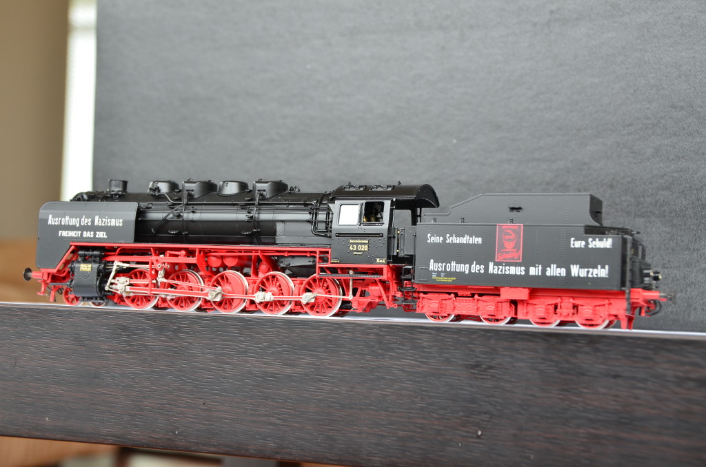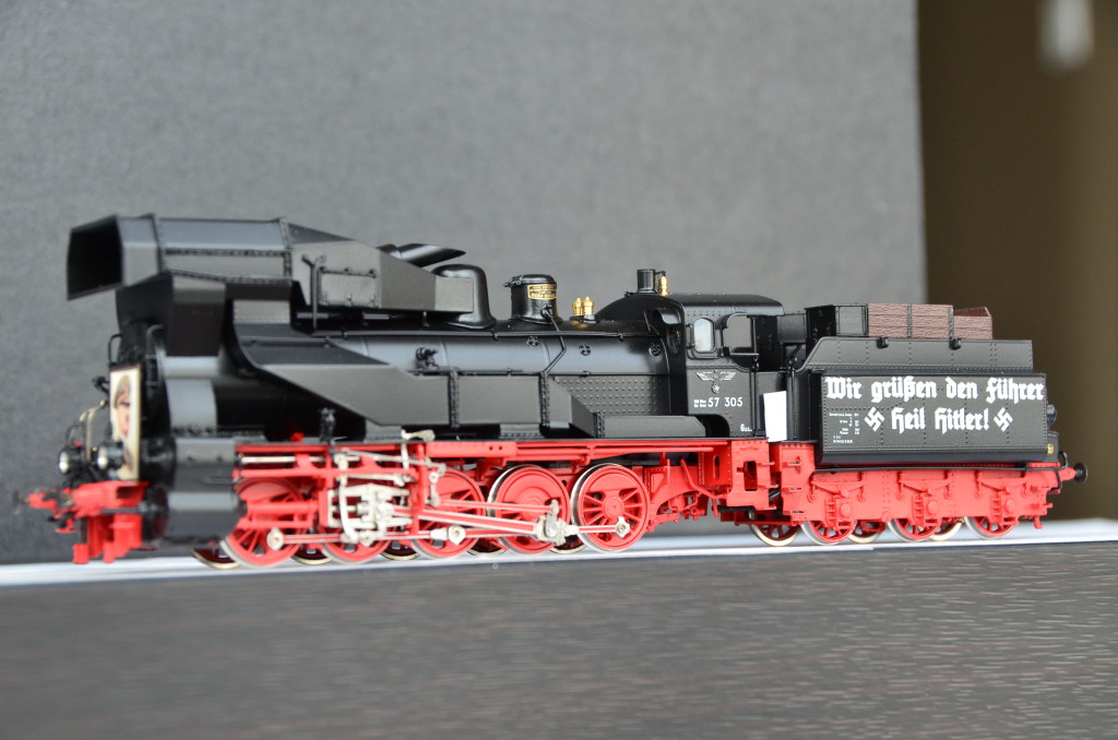 А вообще, Алексей, нетрудно предположить, что такие дотошные ребята, как ММ и МФ, создающие паровоз из 2 тысяч деталей, вряд ли накосячили и забыли, что Гитлер пришел к власти на 5 лет позже, чем изображен на данном паровозе. Свою-то историю немцы должны же знать мало-мальски - даже у нас обычно в фильмах о второй мировой, например, стараются не использовать автоматы Калашникова и реактивные Миги... Я не буду претендовать на истину в последней инстанции, но предположу, что агитационные версии они не просто из пальца высасывают, типа, мы нафантазировали тут, а вы считайте до конца дней, что все так и было. А то нелогично получается: все версии правильные и полностью соответствуют оригиналу, а именно пропагандистские - косяк на косяке, сплошные фантазии. Думаю, что они просто не делали бы их, чтоб не подрывать свою репутацию, чтоб никто не мог за руку поймать и обвинить в полном несоответствии. Иначе судьба всех дальнейших придуманных агитпроповских версий была бы для большинства коллекционеров решена - не всем пофигу "было-не было", поверьте, особенно среди таких дотошных людей, как немцы и особенно среди коллекционеров ММ, еще более дотошных, чем обычные немцы. В недостоверности исполнения можно, наверно, и все тестовые версии обвинить - начиная от того, что их вообще не было в природе и кончая тем, что провода в жгуте не так скручены были и не так на котле болтались. Кстати, Дирк Аде из АйзенбанКанады, если верить их сайту, проработал в ММ/МФ около 30 лет и то, что он изображает сейчас на паровозах в единственном варианте от EisenArt - тоже не факт, что полная туфта, так как человек в теме. Фотографиями и картинками, как , впрочем, и чертежами, они пользуются не из интернета - это и так понятно. Кроме обсуждаемого паровоза тиражом 25 экз., на защиту которого я встал :-), ММ выпустили по заказу Brass department еще одну версию, тиражом 10 экземрляров. (Надо же было испачкать в совокупности 35 паровозов не существовавшими лозунгами, лучше бы увеличили тираж достоверных версий, нет?) Так вот на этих 10 экземплярах вообще есть типа ошибки в немецком языке. Только я не поленился немцев спросить, возможно ли такое написание, так как , опять же, тяжело было поверить, что ребята из ММ/МФ не только в родной истории, а и в синтаксисе родного языка косячат. Если по уму, то надо писать Hitler sei unsere Stimme ( Гитлер, стань нашим голосом), а не Der Hitler unsere Stimme sei. Оказалось, что именно такая надпись, как на тендере, имеет право на существование, так как подчеркивает высокий, пафосный стиль. Вряд ли ее придумали и высосали из пальца далеко не поэты Раухенэккер или Пасбергер - осмелюсь предположить, что надпись фигурировала на паровозе, также , как и Berlin! Trotz verbot nicht Tot.