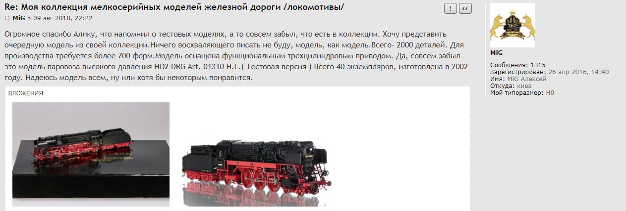 при покупки Н02 1001 я с Алексеем говорил про тираж модели .......brassfanat писав:Ну, формулировка «няз»или «насколько я знаю» не совсем предполагает «Маниакальное упрямство». Алик, вероятно ошибся, так как Алексей про сорок экз. этого паровоза, как он мне признался , не говорил. Мне казалось, что я видел эту инфу в ветке «обзор тестовых моделей паровозов», но и я, скорее всего, ошибся и там ничего на эту тему не нашел- вероятно перепутал модели 081001 и 021001. Если рассуждать логически, то ни одной тз известных мне тестовых версий не было больше 40 шт. Обычные тиражи-15,20,25’30’40 шт. Учитывая номер модели Алика-37 и видя статистику , несложно предположить, что моделей действительно сорок. Но это все домыслы, а у Вас ведь, судя по уверенному тону, которым вы оспариваете эту цифру, есть достоверная инфа о тираже тестовой версии Н021001? Поделитесь, пожалуйста.T-1000 писав: Не понимаю, как некоторые с маниакальном упрямством вторят один другому о сорока экземплярах H 02-го, скажите откуда у вас такая информация?