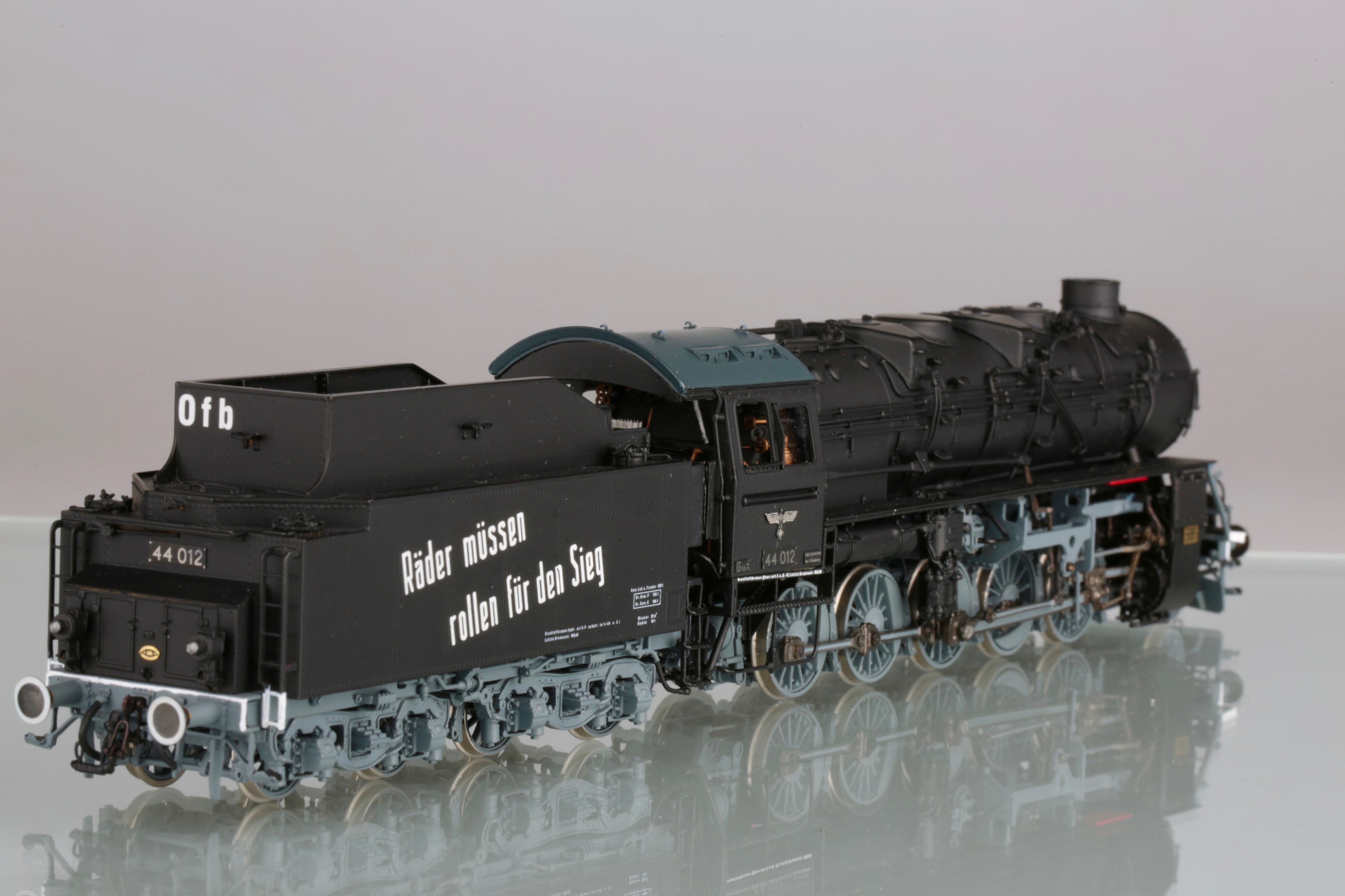 Представляю модель, германского грузового паровоза BR 44 012 DRG от Micro Metakit.Art. 99102 H. Ограниченный тираж-20 экземпляров, изготовлена в 2000-м году.Всю эту полукилограмованную красоту грации и изящества,( а вес локомотива без тендера составляет-575 гр, плюс 175 гр.вес самого тендера) приводит в движение двигатель и редуктор фирмы Faulhaber, причем все усилие передаются только на одну ось, дабы каждый мог насладиться и полюбоваться копийностью и совершенством ходовой частью модели.Особого внимания заслуживает рама паровоза, выполненная в полном соотвествии с прототипом, а какая изумительная тормозная система, как впрочем и ПР механизм, низ тендера- просто соловьиная песня, да и все остальное просто изумительное, про цвет и покраску модели говорить вообще нечего- кто еще может похвастаться такой изумительной работой? Для того что бы истинные любители железнодорожных моделей, могли восхищаться несравненной красотой и техническим изяществом, специалистам Micro Metakit пришлось раскроить, собрать, а потом покрасить модель, состоящую из всего-то 1910 деталей.Конечно и просто необходимо, всю эту филигранную красоту дополнить упаковкой, хотя нет, слово упаковка здесь не подходит, как-то по мещански, скорее обрамить и подчеркнуть монументальность модели, что и было исполено.Модель нежится в футляре из массива ореха покрытого матовым лаком.( вес футляра-2 кг.) Не знаю, как кто, лично я просто восхищаюсь такой гармонией,посему предлогам всем насладиться модельным вальсом.