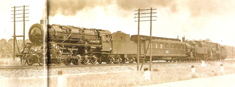 Im September 1942 wurde die erste Kriegslok der Baureihe 52 bei Borsig fertiggestellt. Durch bauliche und technische Vereinfachungen sollte eine Leistungssteigerung herbeigeführt werden. So sprach die Propaganda davon, dass im Vergleich zur Baureihe 50 etwa 26000 kg Material und 6000 Arbeitsstunden eingespart wurden. Zusammen mit 50 377 ging 52 001 auf „Propagandafahrt" durch Deutschland, um zu zeigen, mit wieviel weniger Aufwand und Material eine Lokomotive hergestellt werden konnte. Findige Ingenieure erkannten jedoch recht bald, daß die genannten Einsparungen von Kupfer und Zinn Täuschungen waren. So wurde bei der 50er ein Verbrauch von 2358 kg Kupfer und 450 kg Zinn angegeben. Bei der 52er sollten es nur noch 126 kg Kupfer und 23,5 kg Zinn sein. Die größte Einsparung an Kupfer entfiel auf die Kupferfeuerbüchse. Die BR 50 besaß aber wie die BR 52 von Anfang an eine Stahlfeuerbüchse. Dies traf in ähnlicher Weise auch auf die Einsparung an Zinn zu. Die 50er besaß wie die 52er schon längst Dünngußlager.... (12.10.1942) Foto: RVM (Scherl)