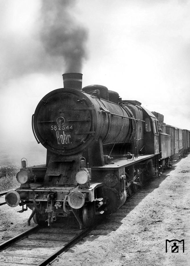 Die im Oktober 1944 von den Skoda-Werke, Pilsen an die RBD Regensburg abgelieferte 52 7519 kam mit "viel Tamtam" nach Ende des Zweiten Weltkriegs wieder zurück in die Tschechoslowakei. Der Text auf der Rauchkammer lautet: "100. zerschossene und reparierte Lok in der Heizhauswerkstätte Prag-Vrsovice." Später wurde sie CSD 555.052 umgezeichnet und gelangte noch als BDZ 15.119 nach Bulgarien. (07.08.1945) Foto: Jaroslav Bures