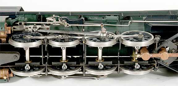 В моделях ранних паровозов компания применила самый простой вертикальный тип котла. Обусловлено это тем, что длина паровозов на заре их появления была не более 5-6 метров и горизонтальные котлы просто не помещались в габариты модели. Основное преимущество вертикального типа – многотопливность, простота изготовления и относительно большая емкость. Котлы могут работать почти до полного испарения воды. Даже при низких уровнях воды в баке она омывает все жаровые трубки и угрозы перегрева и распайки соединений нет. Эффективность парообразования небольшая ввиду малой площади испаряющей поверхности. Тяга создается высотой трубы и не требует применения инжекторных устройств. Не сложнее и котел Пот типа (Pot Type). Топка в таком котле расположена вдоль всего барабана котла. Отсутствие жаровых трубок компенсируется боковыми направляющими, которые создают контакт горячих дымовых газов с 2/3 поверхности барабана. Через эту поверхность и происходит теплопередача (чайник). В общем преимущества и недостатки Пот типа аналогичны вертикальному котлу. Принципиальная разница в его продольной компоновке на раме модели. Интереснее конструкция седельного котла. Здесь емкость с водой как бы охватывает топку, проходящую по всей длине котла. Помимо большой площади теплопередачи стенками топки в процессе еще участвуют циркуляционные трубки, пересекающие топку. Перегородка в топке создает эффект реверсивного движения дымовых газов, что способствует наиболее полной теплоотдаче. Газы сначала направляются к задней стенке, а затем разворачиваются вперед в направлении дымовой трубы. Такой реверсивный принцип используется на современных водогрейных котлах, например немецких Wiessman и Buderus или бельгийском ACV . Водяные трубки, расположенные под углом к горизонтальной плоскости создают принудительную циркуляцию в котле, которая не позволяет задерживаться пузырькам пара на поверхности испарения. Постоянным перемешиванием устраняется теплоизолирующий паровой слой между водой и теплопередающими стенками топки и самих трубок.
