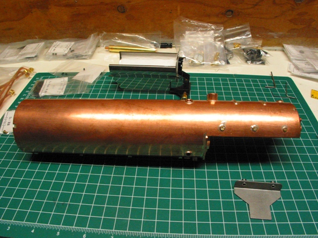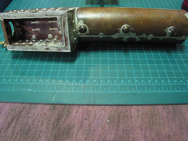 Барабан котла с дымовыми трубами имеет вырез в задней нижней части для установки "сухой", т.е. не омываемой водой, топки Сама топка выполнена из нержавейки и облицована теплоизолирующим слоем из керамической ваты Отдельный лобовой лист служит для декоративных целей и закрепления арматуры: регулятора, крана сифона, клапана свистка, водомерного стекла, манометра, крана отбора пара на смазочное устройство (лубрикатор). Медная жаровая труба (обычно диаметром 16 мм) позволяет разместить в ней петлю перегревателя В дымовой коробке тоже всё, как у людей - сифон, коллектор перегревателя, трубки подачи смазки