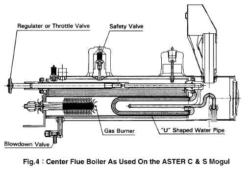 Котлы предыдущего типа и типа С в моделях Aster Hobby отапливаются спиртовыми горелками. Более редкий тип котла как бы объединяет преимущества котлов попроще. В нем применена технология принудительной циркуляции, как в седельном котле. Увеличенный размер топки, входящей внутрь барабана, делает площадь испарения не меньше, чем в котлах Пот типа. Внутренняя топка позволила разместить жаровые трубки довольно большого диаметра (как в центральном типе) и установить перегреватель.