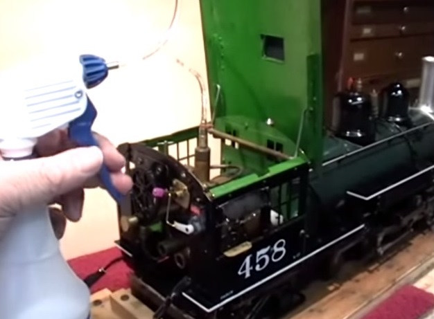 На ковре не случайно... Паровоз этот не совсем полноценный live steam. Вода греется электрическим тэном. Зеленые и красные лампы, которые светятся в будке, сигнализируют о режиме нагрева.