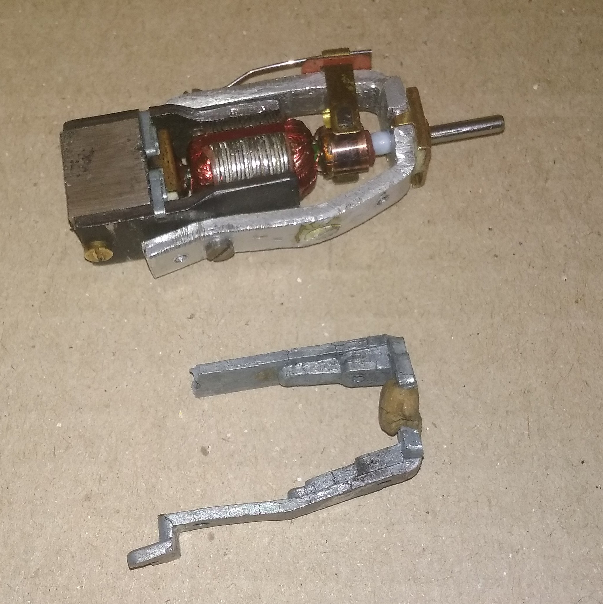 Можно было бы заменить мотор, но в паровозе стоял пятиполюсный двигатель, поэтому решил всё-таки восстановить родной мотор. Подобрал алюминиевую пластину подходящей толщины, отрезал полоску нужной ширины, посверлил где надо отверстия. После этого согнул её по габаритам старой рамы , «пересыпал» в неё ротор, магнит и подшипники, щётки с держателями. Немного пришлось поиграться с соосностью, но в результате двигатель заработал.