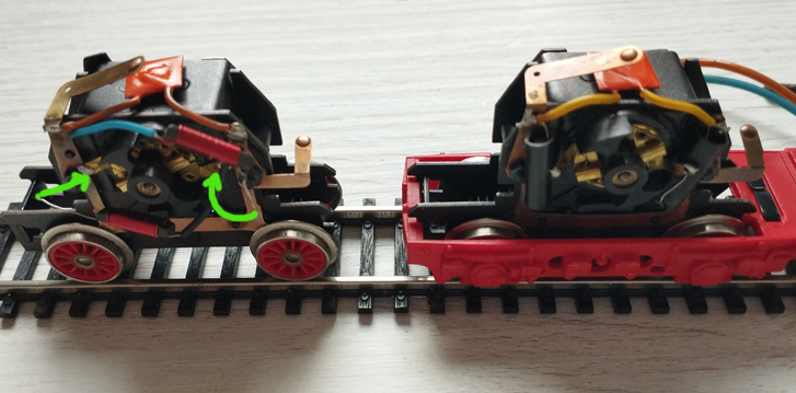Но проблема в том, что одна тележка не работает. При чем, если ставишь на рельсы обе разобранные тележки, то рабочая перестает двигаться. Едет,только если убрать нерабочую.