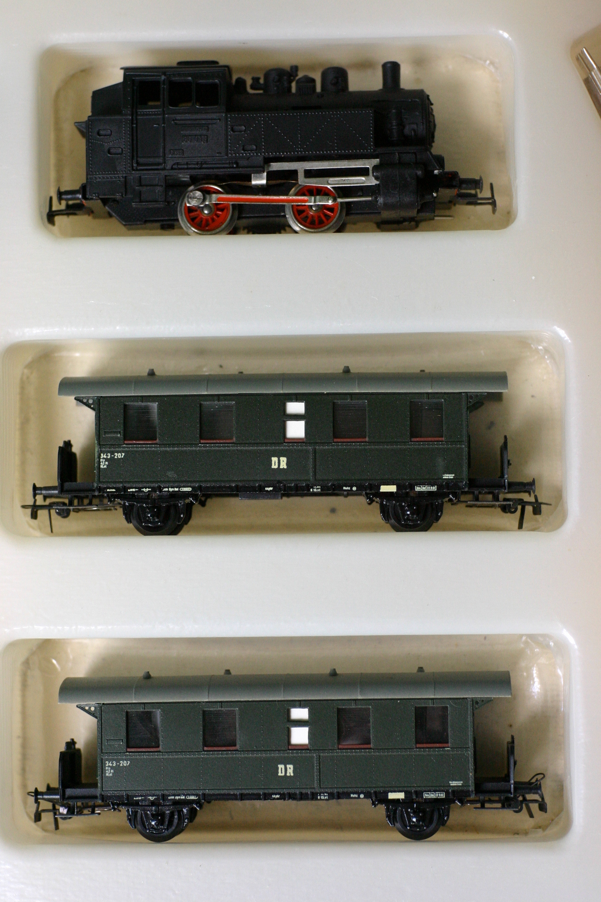 Денис,добрій вечер. Спасибо за желание помочь разобраться. Тогда ещё есть вопросы, да я видел полностью серые, но они как правило двухосные и пропилов по корпусу некоторых нет, равно как и фигурки. У нас ( имеется виду с моими пацанами, поэтому так пишу :) ) есть один стартовик из 60-х наверное, там чёрный лок карболитовый и пятиоконные вагоны, но у лока есть имитация передних фонарей, а здесь судя по всему были на переднем брусе, сейчас отломаны и их нет, а под котлом площадка из жестянки и картонки окрашенной. Может какие фото интересные есть по пиковским БР80, да и вообще фото по БР80 не рядовые. Серый ливер, это я так понимаю ДРГ?