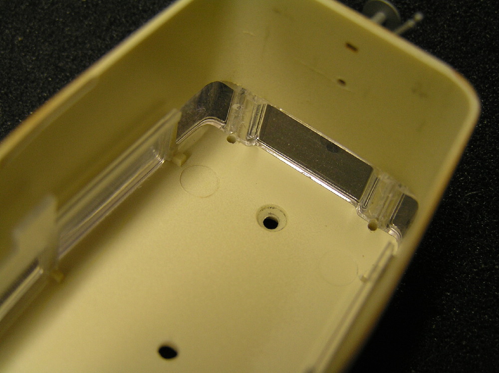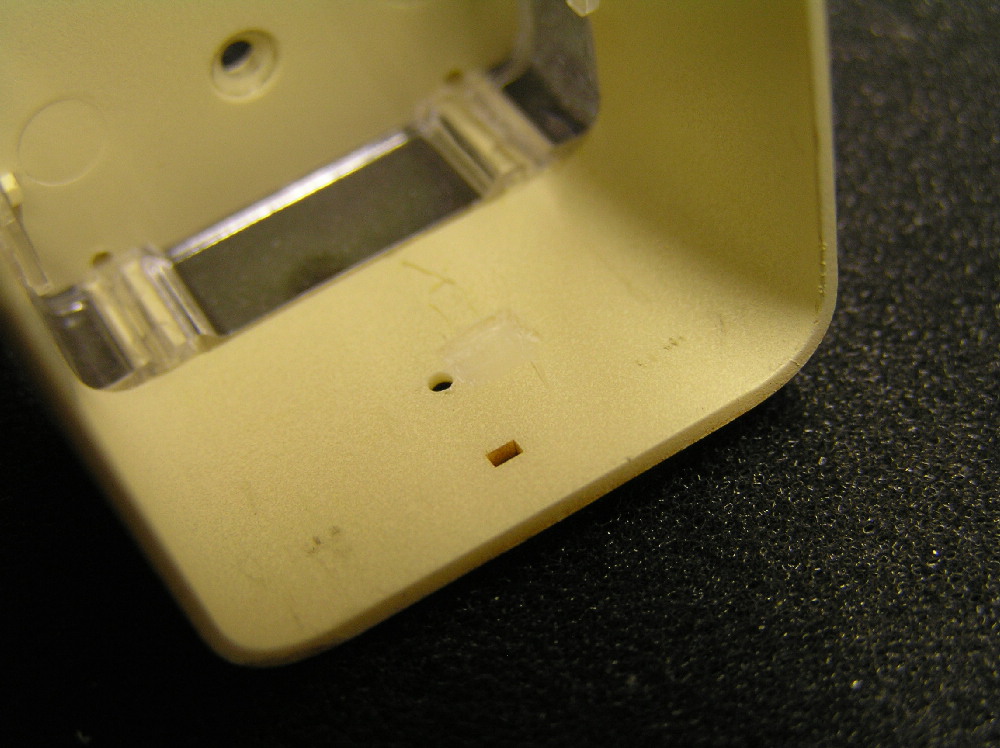 зробив два отвори діаметром 1мм в кришу для заведення дротів та чотири отвори діаматром 2мм напроти світлодіодів освітленя салона (на фото потрапив тільки один з чотирьох)