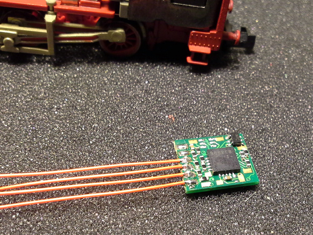 ... Даже при толщине провода 0,03 мм2 корпус не садился на место. При таких размерах каждая десятая доля миллиметра на счету! При окончательной сборке были "танцы с бубном": двадцати-тридцатикратное снятие/установка корпуса. В итоге им же (корпусом) повредило изоляцию, за счет чего возникло КЗ. Спалил один декодер (такое бывает, но это проблемы установщика, т.е. мои), заказчик получает модель за заранее оговоренные деньги. Фото не делал, уже было не до этого, но пришлось протачивать в пластиковой крышке двигателя углубления для укладки проводов.