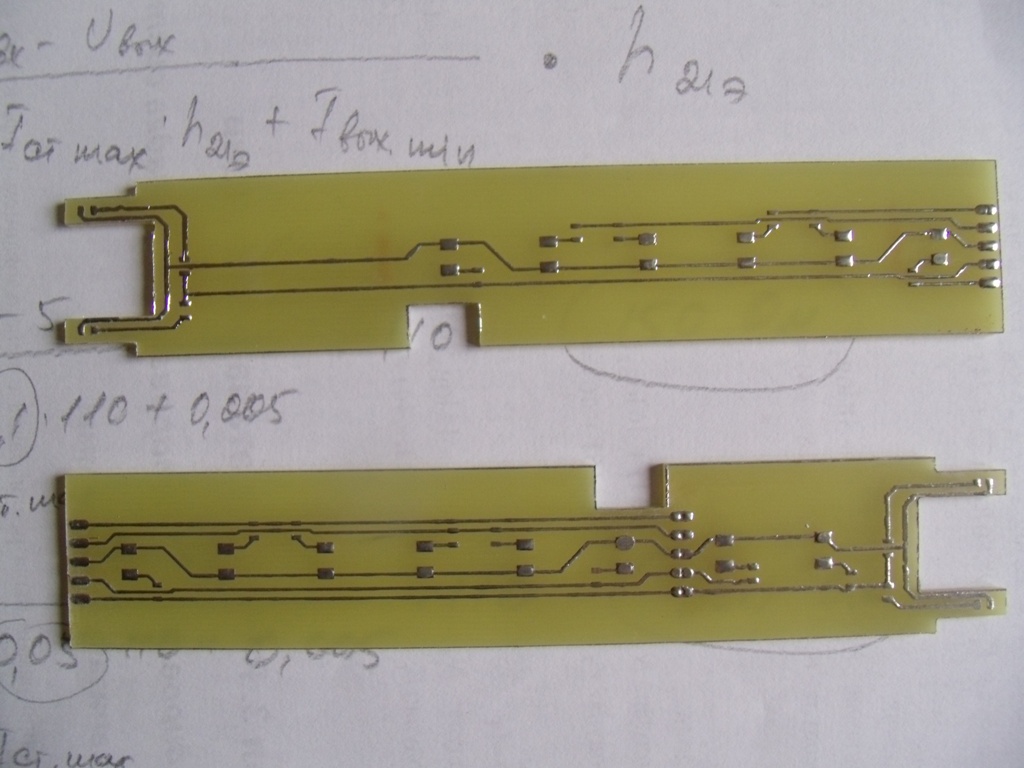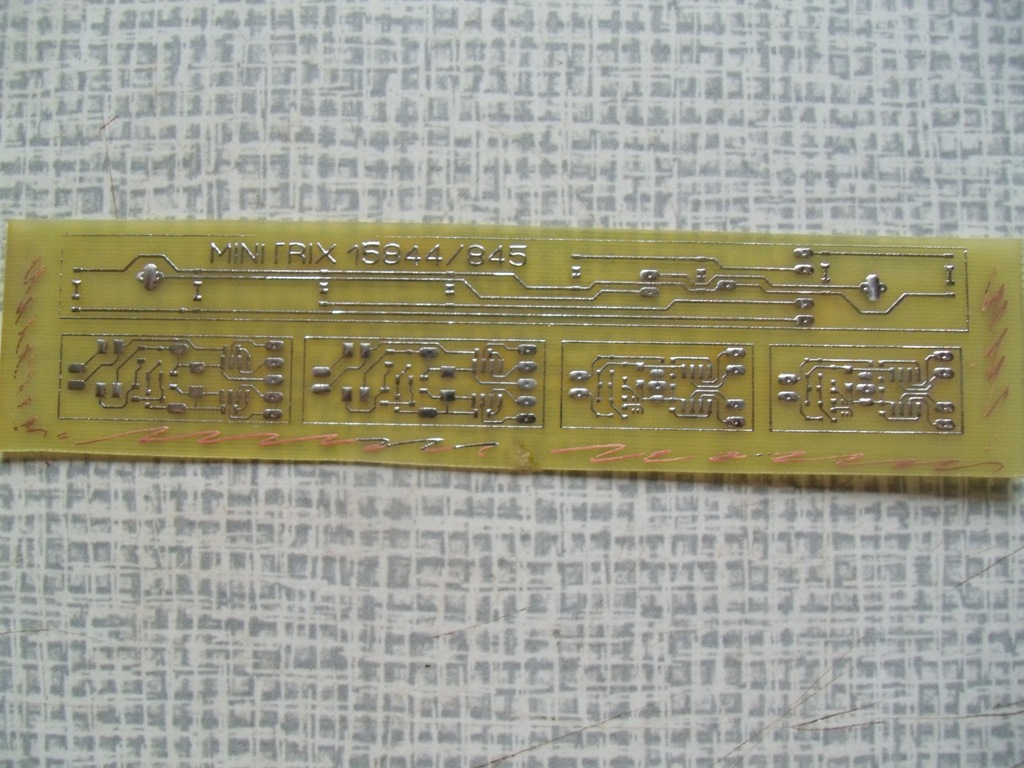 Это просто в одном заходе травились: 2 платы декодеров для Сапсана (снизу слева), плата освещения для ICE-3 в N-ке (сверху) и 2 платы декодеров для нее (снизу справа). Они из одного материала - 0,5 мм стеклотекстолита.