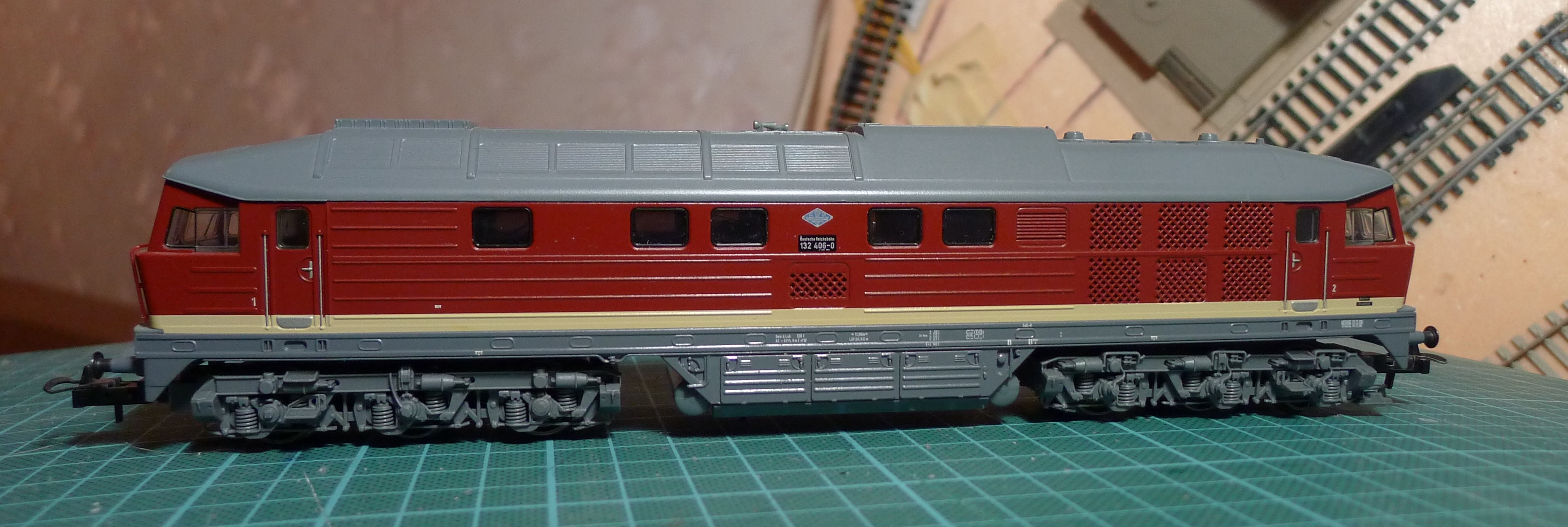 Попытался добится "рабочего" вида тепловоза. На многих фотографиях из ГДР видно, что машины подкопчены, краска несколько выцвела. Что-такое попытался изобразить и я. Фотки попробую подобрать "Было/стало". Левый (от кабины №1) борт: Второй борт: Мордаха.