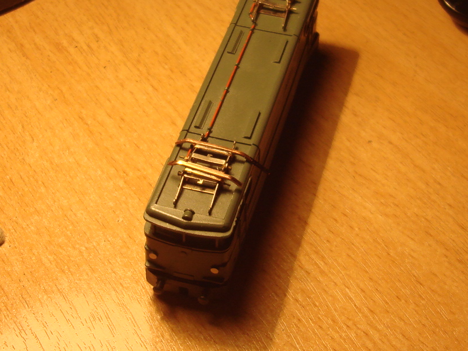 Начал с пантографов. Использовал для этого стальную проволоку диам 0,46, медную проволоку и листовую латунь. После длительного выпячивания глаз, получилось то, что на фото