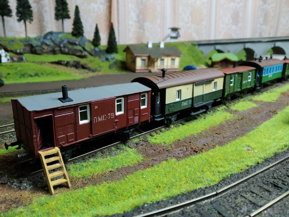 Вагонов ПМС уже вполне достаточно. Вместо трёх, запланированных изначально, сделано и размещено пять. Но у меня давно обитает вот такой подкидыш.