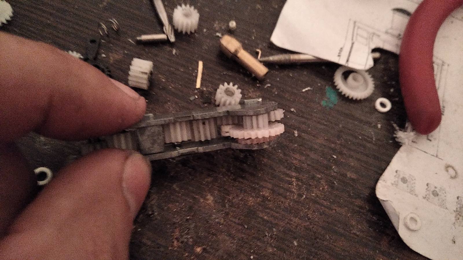 Также заменил родные красные шестерни (увы почему-то в хламофотках фото не осталось), на идентичные китайские, с той лишь разницей, что китайци чуть крупнее. На самом деле какие стоят в промежностях, значения нету. Основная идея заключалась, чтобы увеличить передачу с двига на оси не просверливая отверстия. Шестерни подобрал таки и сделал не так как в родном редукторе (внизу справа редуктор идентичный родному), все шестерни прямые.
