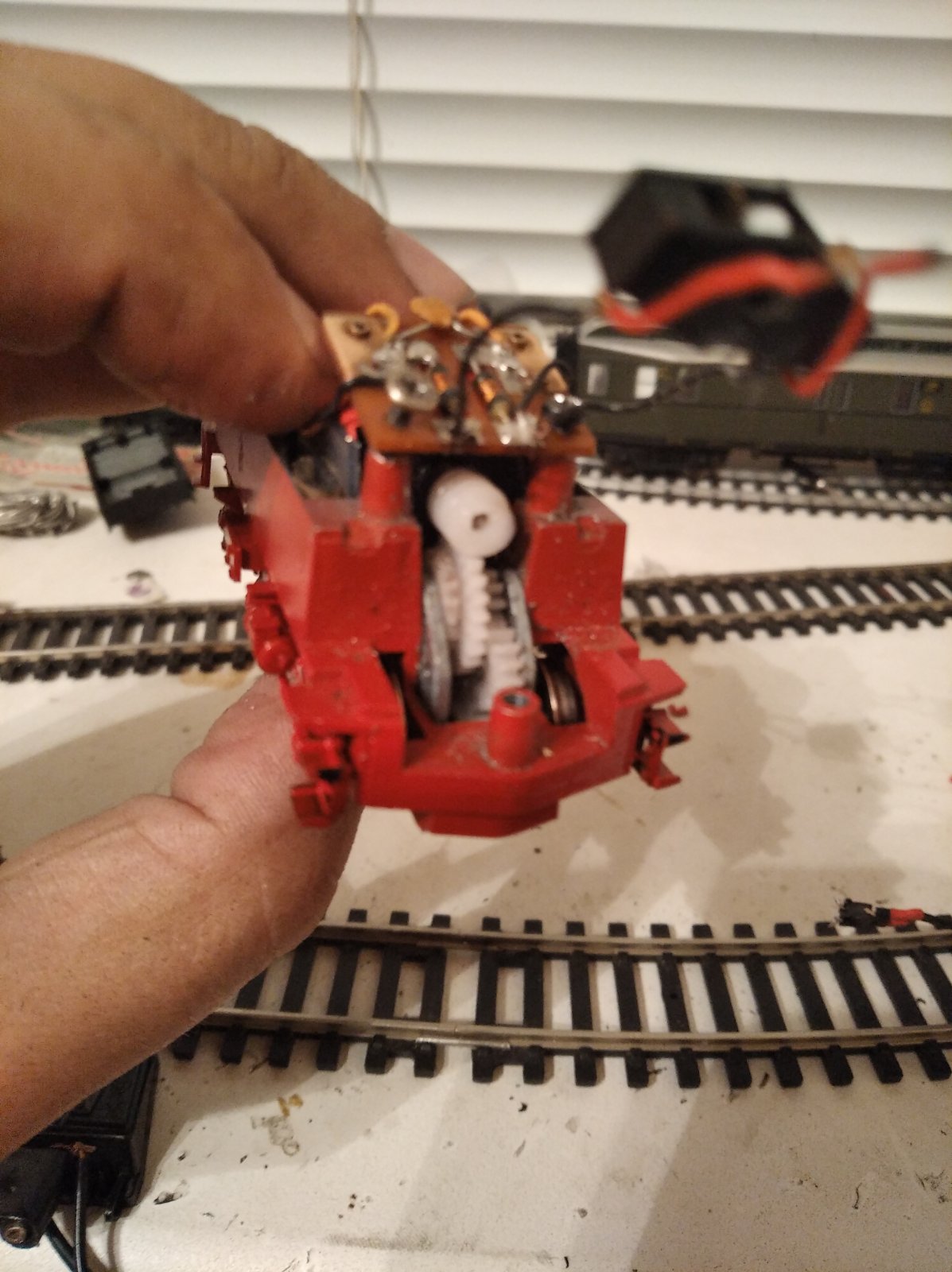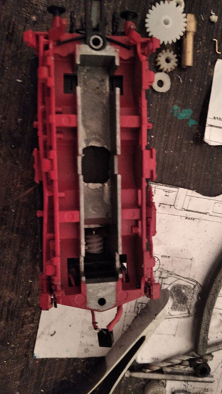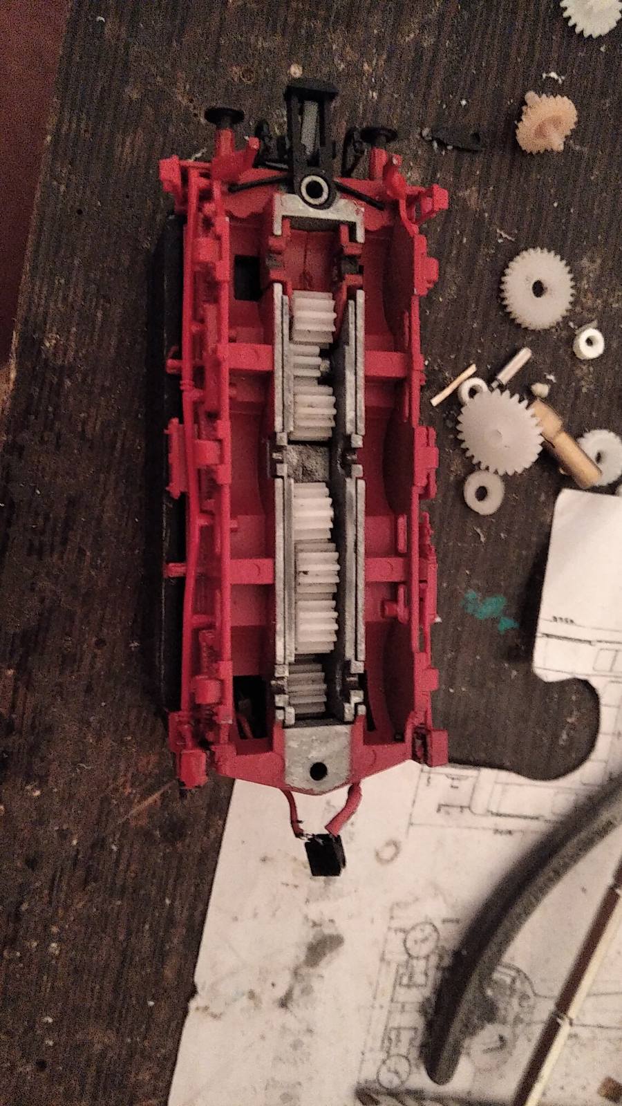 Фото уже с мотором и основное, наиболее понятное фото спереди, сути переделки. Однако пришлось таки подточить крышку тендера, мотор влез, а вот плата не совсем. Родные шестерни и мотор коробок. А модель на полочку.