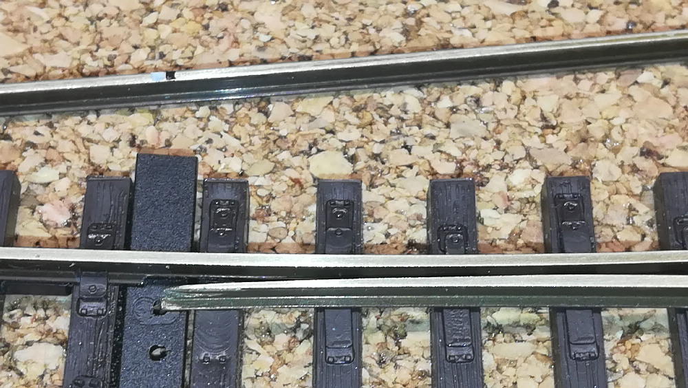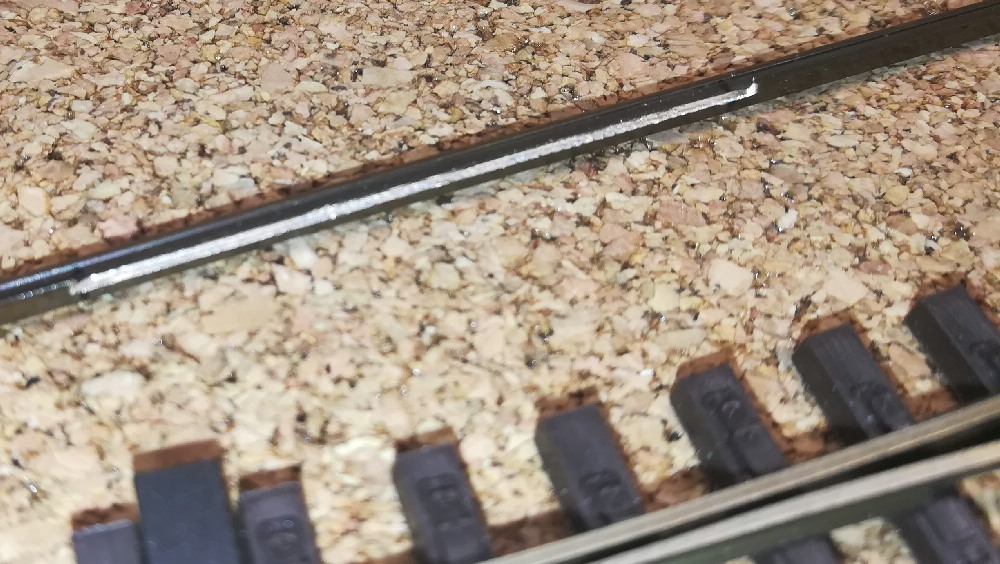 Спочатку розмічаю довжину виборки для пера стрілки Для "розпаковки" стрілок потрібно видалити фіксатори реєк. У Tillig це маленькі кульки приварені точковою зваркою. Їх потрібно обломати, після чого є можливість вийняти рейки зі шпал Фрезерую виборку в довгій рейковій нитці, щоб використати її єдиною (без стиків) для декількох стрілок