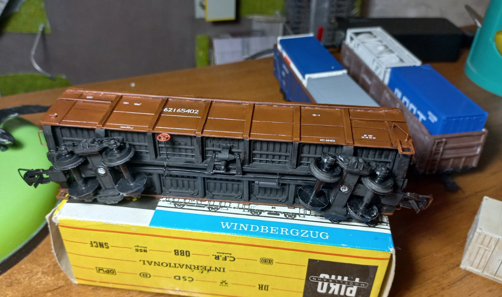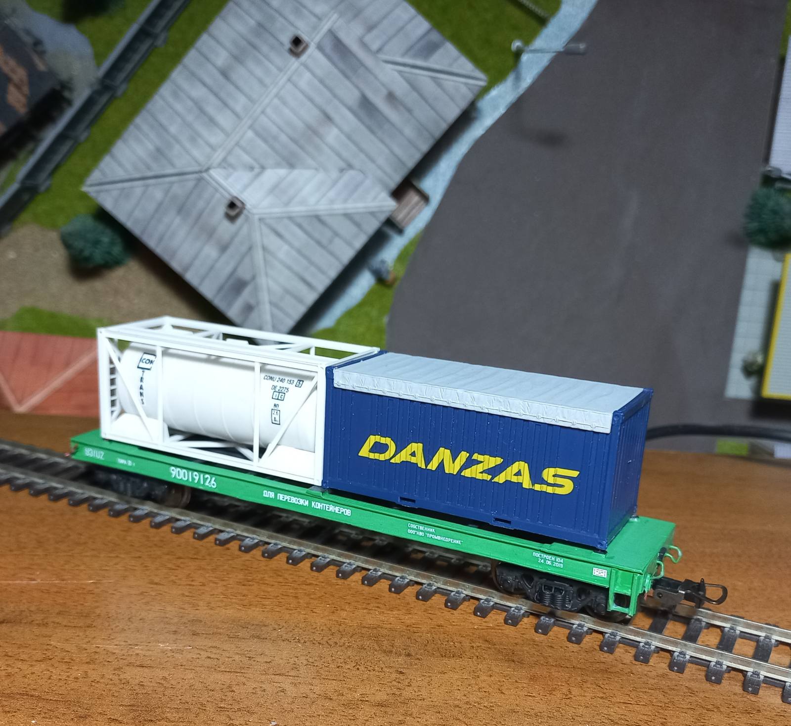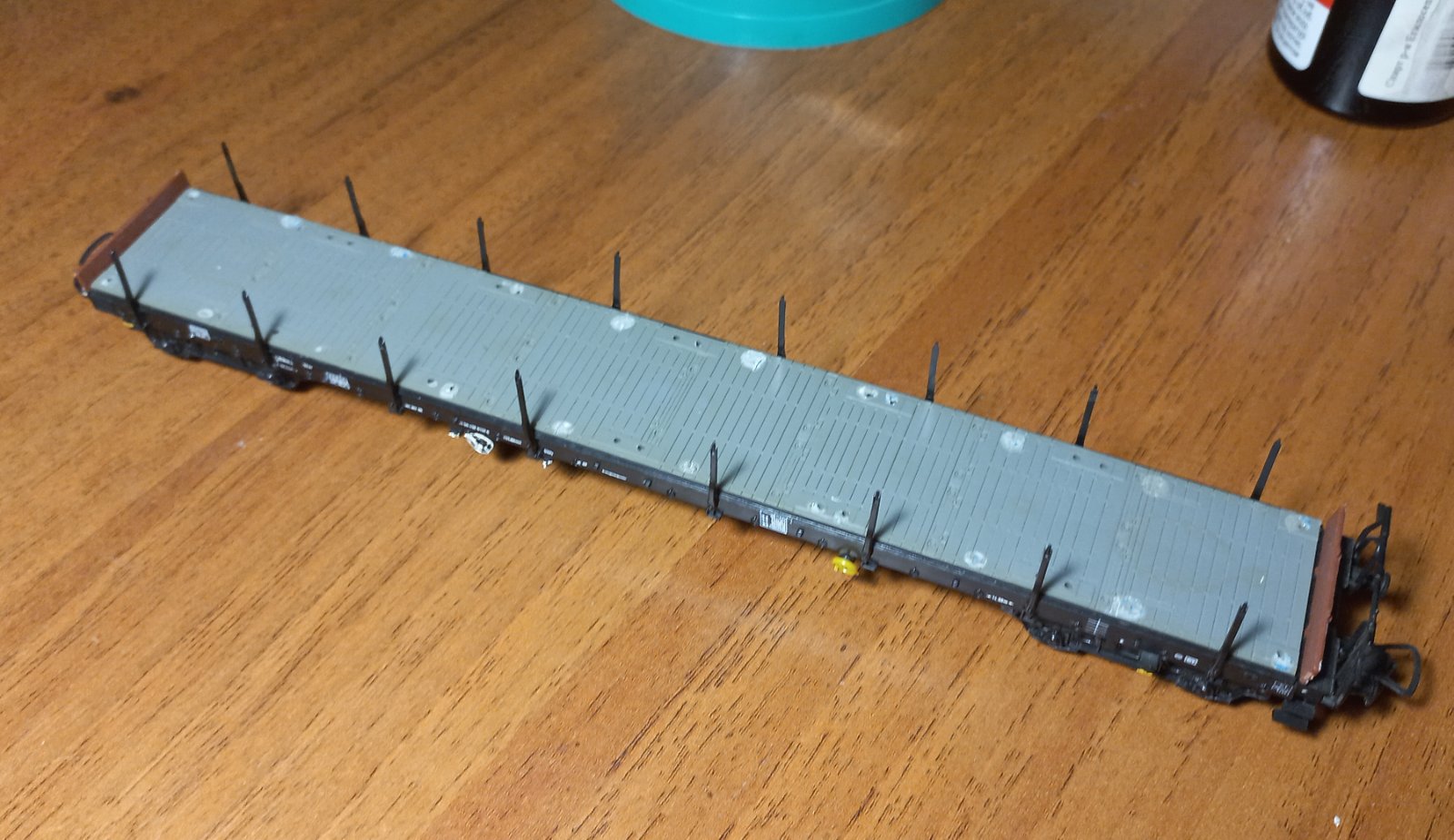 Довго шукав, але таки не знайшов "піковський" контейнеровоз у незайманому стані. Зазвичай, з них обдерте було все - починаючи від контейнерів, і закінчуючи дрібними деталями. Стійки, підніжки, тощо. Був варіант взяти нове "Піко", але ті вагони зі стартовиків без жодних написів... Дякуючи уважному Stinky, який побачив у продажі пакетик з накладухами на подібні вагони, стало можливо шукати варіанти з втратами. Натрапив на платформу, яка була більш-менш ціла. Але були відсутні стійки, та приклеєні нерідні контейнери.